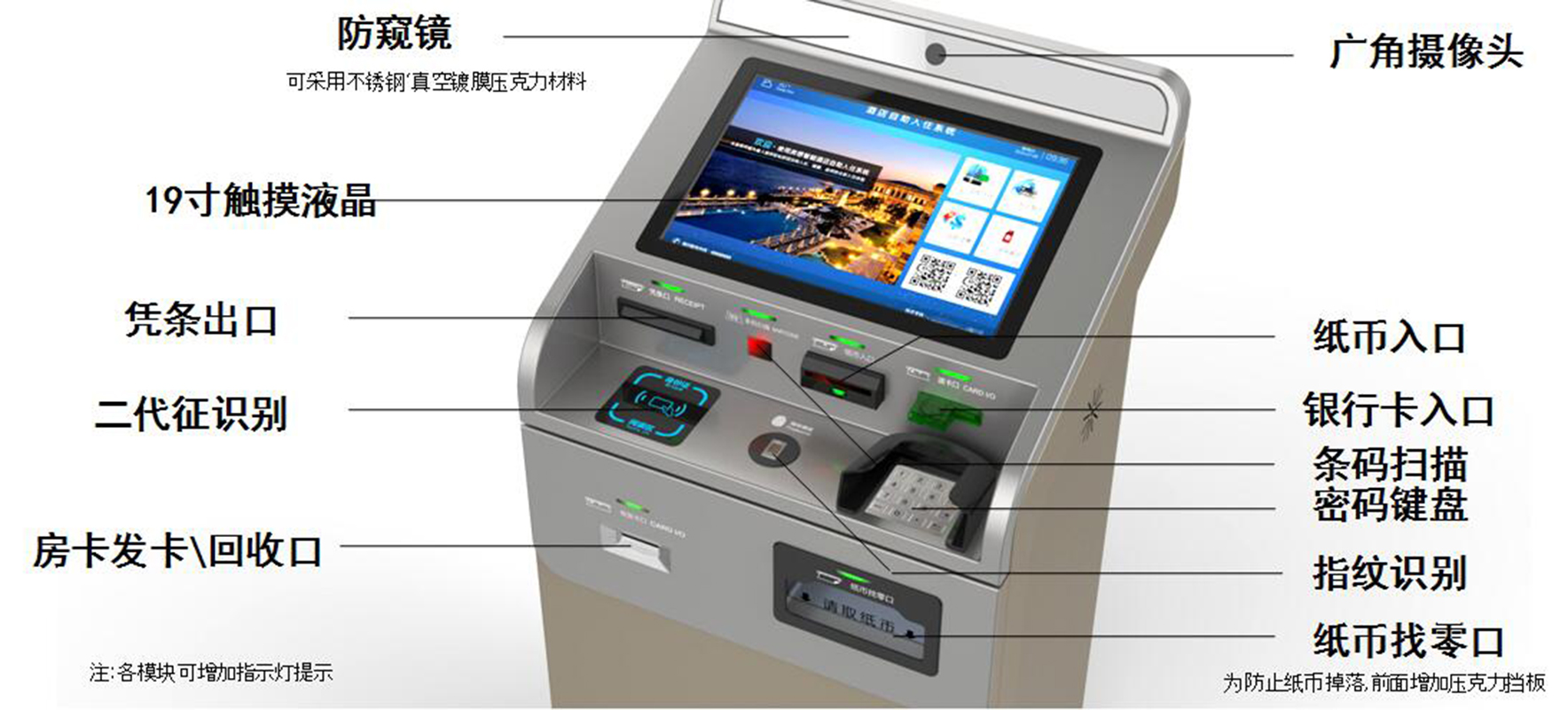 ? ? ? ?酒店自助入住機(jī)是一種無人值守、操作簡(jiǎn)單、查詢方便快捷的人機(jī)交互設(shè)備。?客人可以通過自助入住設(shè)備自助開房,退房,結(jié)賬離店。達(dá)到提高顧客辦事效率、節(jié)約時(shí)間,時(shí)間節(jié)約酒店運(yùn)營(yíng)成本、提高服務(wù)質(zhì)量的目的。其具有服務(wù)完整性、可視性、系統(tǒng)化和可維護(hù)性,是酒店自動(dòng)化處理業(yè)務(wù)的有效保證