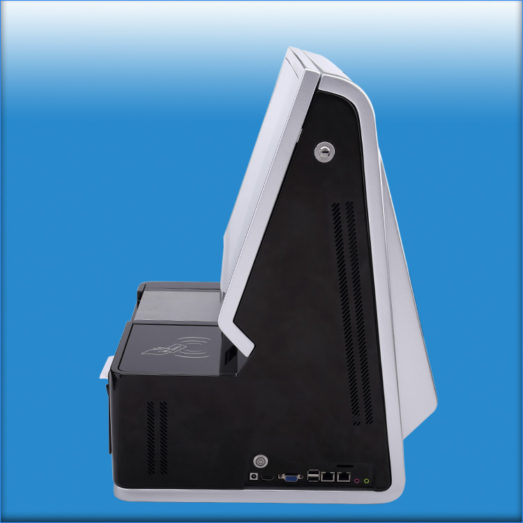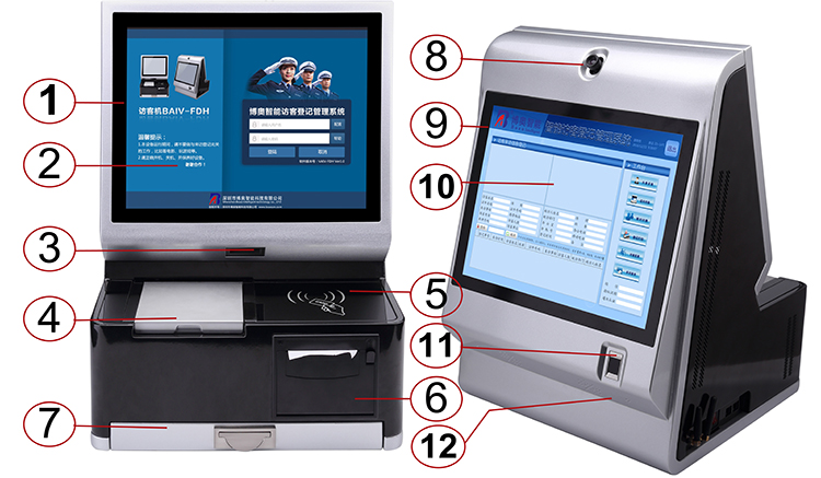 1、觸摸屏 2、15寸屏3、條碼掃描槍4、證件掃描儀5、IC卡讀寫/身份證閱讀器6、熱敏打印機(jī)7、鍵盤 8、攝像頭 9、鋼化玻璃10、15寸副屏 11、指紋儀