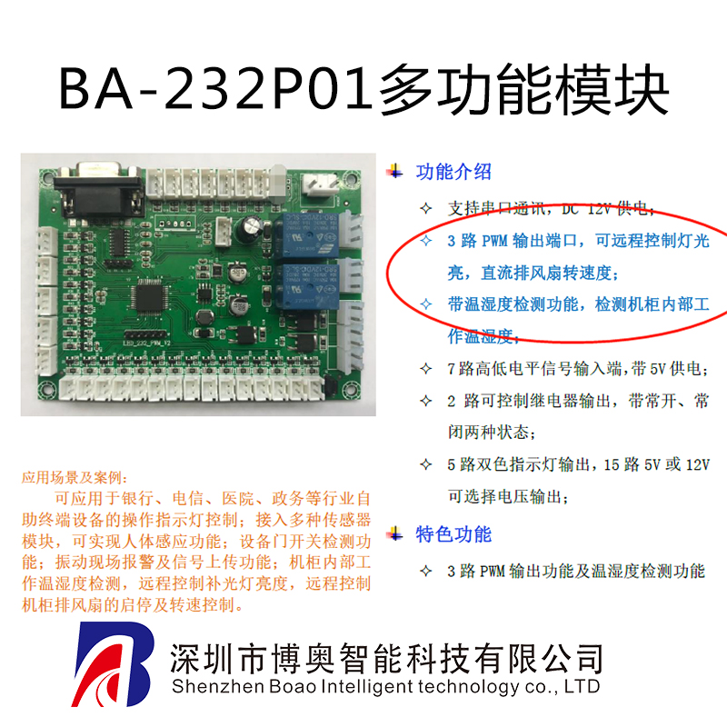 該產(chǎn)品是專為自助終端設(shè)備配套開發(fā)的一款多功能控制模塊,可應(yīng)用此模塊實現(xiàn)各模塊操作指示燈的提示控制、接收開關(guān)量的輸入上傳、繼電器常開、常閉輸出、PWM輸出功能以及溫濕度檢測功能;