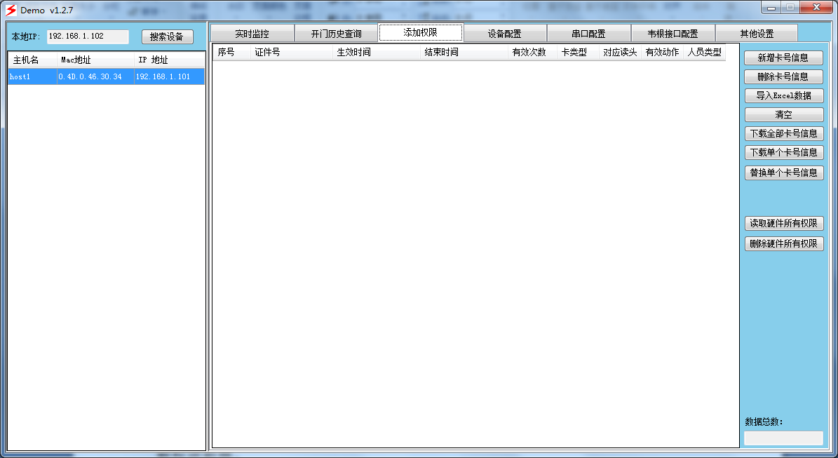 ??? 電腦白名單驗證。設(shè)備讀取到身份證信息后,發(fā)送給電腦,則電腦軟件負(fù)責(zé)檢查身份證是否有開門權(quán)限。這種方式可以通過電腦軟件實現(xiàn)大數(shù)據(jù)量的白名單驗證,以及其它時段權(quán)限控制。