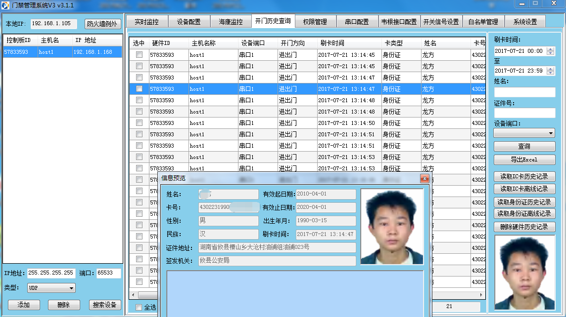 可以按端口號,姓名,證件號,時間,查詢數(shù)據(jù)。