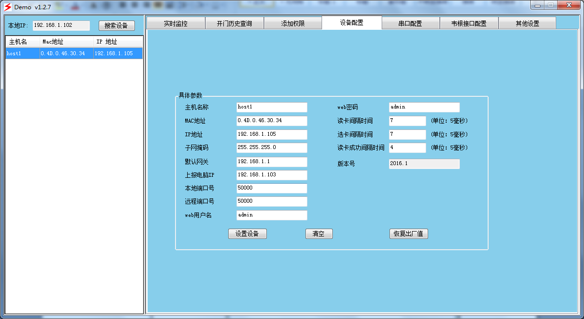 ??? ?將設(shè)備通過網(wǎng)線與電腦直接連接或者通過交換機(jī)連接,在軟件中點(diǎn)擊“搜索設(shè)備”按鈕,列表中將自動列出網(wǎng)絡(luò)中的門禁控制器設(shè)備。選擇記錄后可以查看并修改此設(shè)備的配置。注意必須保證計算機(jī)IP地址與設(shè)備IP地址在同一個網(wǎng)段,默認(rèn)為192.168.1.XX,否則不能成功搜索和修改。(通過網(wǎng)線直連電腦的情況,可能因為網(wǎng)卡不能自適應(yīng)導(dǎo)致搜索或者配置不成功,建議通過路由器連接)。如果計算機(jī)IP地址已經(jīng)修改為192.168.1.XX仍然不能搜索到設(shè)備,可以人工恢復(fù)默認(rèn)設(shè)置(在斷電時按住恢復(fù)按鈕加電,5秒后松開,鳴蜂器響即恢復(fù)成功)。