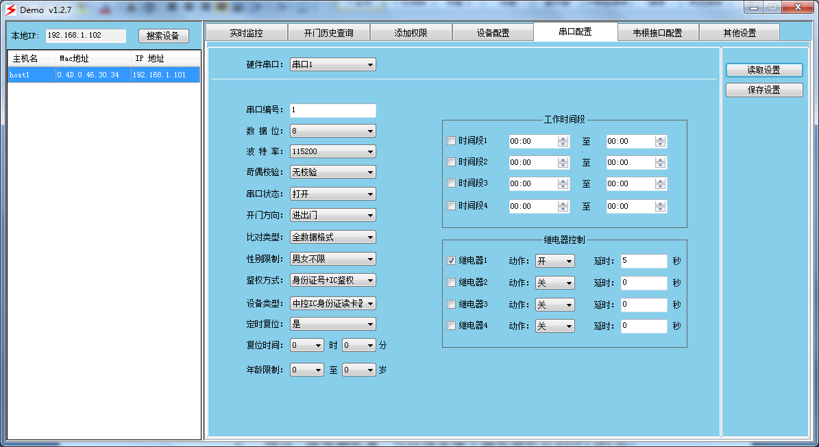 設(shè)備通過以太網(wǎng)接口與電腦連接,實現(xiàn)設(shè)備配置,權(quán)限配置,實時上報監(jiān)控,遠(yuǎn)程開門,控制器歷史日志下載等。