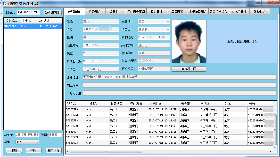 ??? 刷身份證自動開門。設(shè)備讀取到身份證信息后即開門,即所有身份證都自動開門。同時可以配置將采集到的身份證信息上報到電腦存檔備查。