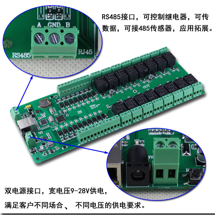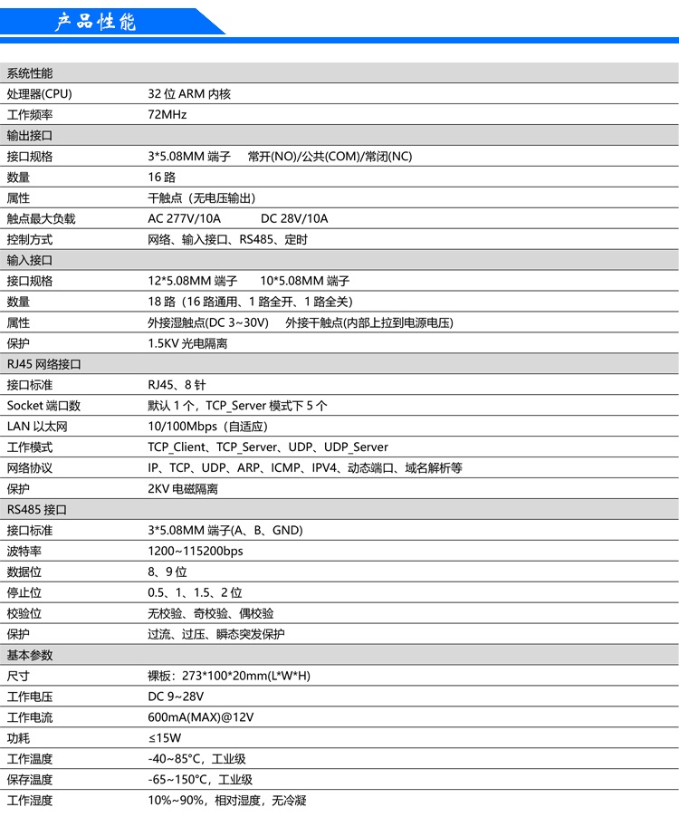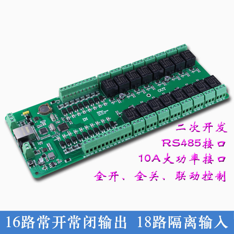 ??? 設(shè)備采用工業(yè)級(jí)設(shè)計(jì)方案,搭載32 ARM 處理器和10/100M 以太網(wǎng)網(wǎng)絡(luò)方案,具有速度快,運(yùn)算能力強(qiáng),穩(wěn)定性高,抗干擾能力強(qiáng)等特點(diǎn),滿足工業(yè)環(huán)境使用要求。設(shè)備有16 路繼電器輸出、18 路開關(guān)量隔離輸入和1 RS485 接口,繼電器支持實(shí)時(shí)控制、延時(shí)控制、輸入輸出聯(lián)動(dòng)控制、一鍵全開全關(guān)控制、日循環(huán)定時(shí)控制和自定義日期控制等多種控制方式,開關(guān)量輸入狀態(tài)支持被動(dòng)上傳、定時(shí)上傳和觸發(fā)上傳,RS485 接口支持用于控制設(shè)備或傳輸數(shù)據(jù),以滿足更多不同的場(chǎng)合使用,滿足更多用戶的使用需求。