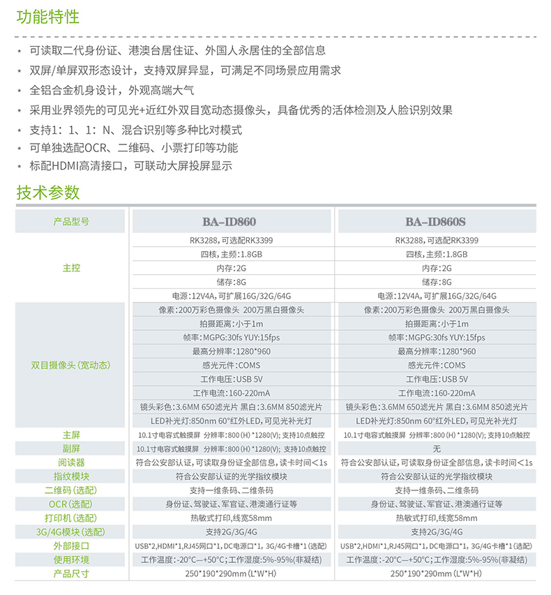 BA-ID860是一款基于Android安卓系統(tǒng)的桌面式雙屏多功能人證核驗(yàn)訪客機(jī)終端,該產(chǎn)品集二代證閱讀、指紋比對(duì)、人臉比對(duì)等核驗(yàn)功能于一體;支持雙屏顯示、二維碼掃描、OCR證件識(shí)別、58式小票打印等功能,外觀精美小巧,采用雙1 0.1 英寸高清電容操作屏,可隨意放置于桌面,滿(mǎn)足不同行業(yè)用戶(hù)的人證核驗(yàn)需求,適用于各行業(yè)領(lǐng)域。