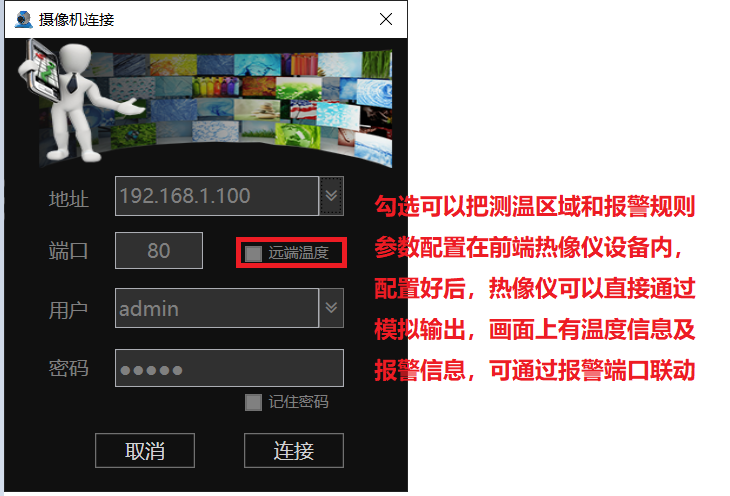 本軟件支持接入具有前端測(cè)溫功能的我司熱像產(chǎn)品,登入設(shè)備的時(shí)候勾選遠(yuǎn)端測(cè)溫即可(需要前端熱像儀支持此功能),設(shè)置方法參考上面說明,配置成功后熱像可以通過模擬輸出連接監(jiān)視器監(jiān)控測(cè)溫,監(jiān)控畫面可顯示配置的區(qū)域及目標(biāo)溫度。產(chǎn)生告警,畫面右上角會(huì)有報(bào)警圖標(biāo),報(bào)警信號(hào)也可以通過熱像報(bào)警輸出口外接報(bào)警設(shè)備。