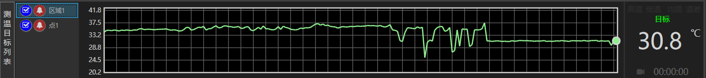 軟件具有告警布防功能,默認(rèn)打開,在軟件下方測(cè)溫目標(biāo)列表,可以配置設(shè)置的區(qū)域的布防開關(guān),還可以顯示和隱藏?zé)嵯褚曨l中設(shè)置的測(cè)溫點(diǎn)和區(qū)域。選中某個(gè)區(qū)域,下方可顯示該區(qū)域的最高溫及統(tǒng)計(jì)曲線。
