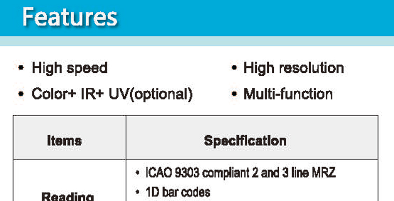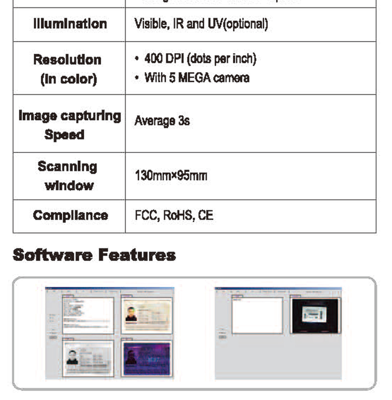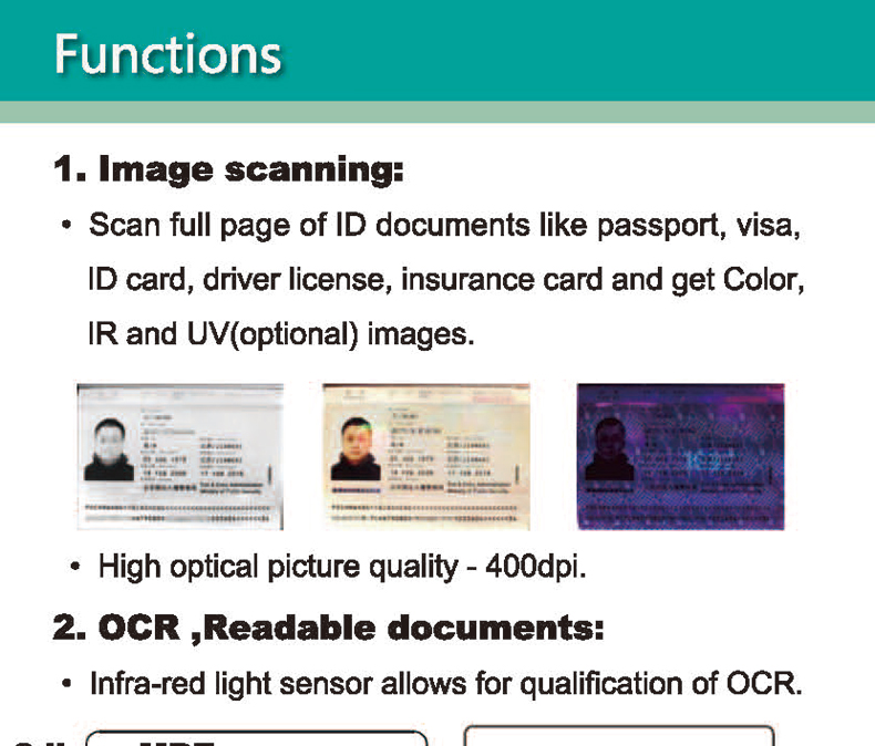 This is a high resolution document scanner for access control to speedread and verify ID documents like Passport, visas, identity cards, driver’s license, insurance card, medical card, so as to speed up the work flow and improve the work efficiency. It fulfills the globally growing needs for automated