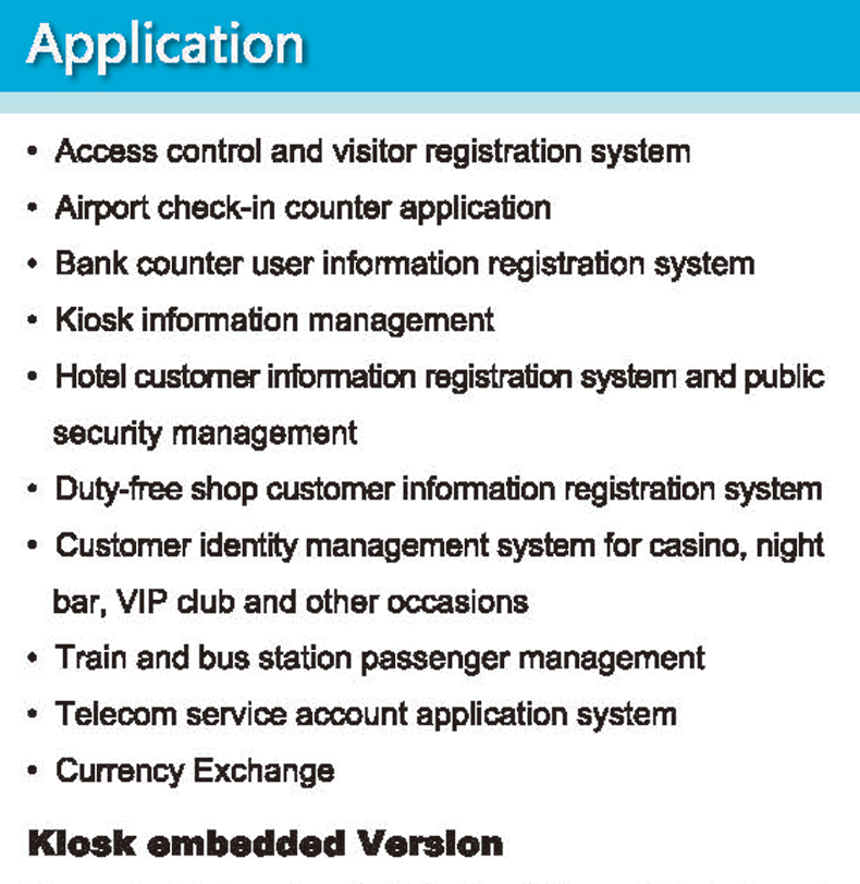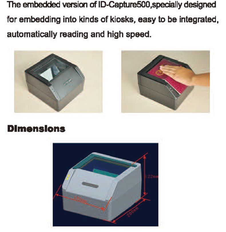Embedded ID- Capture500 is specially designed for embedding into kinds of kiosks, easy to integrate, automatically reading and high speed.