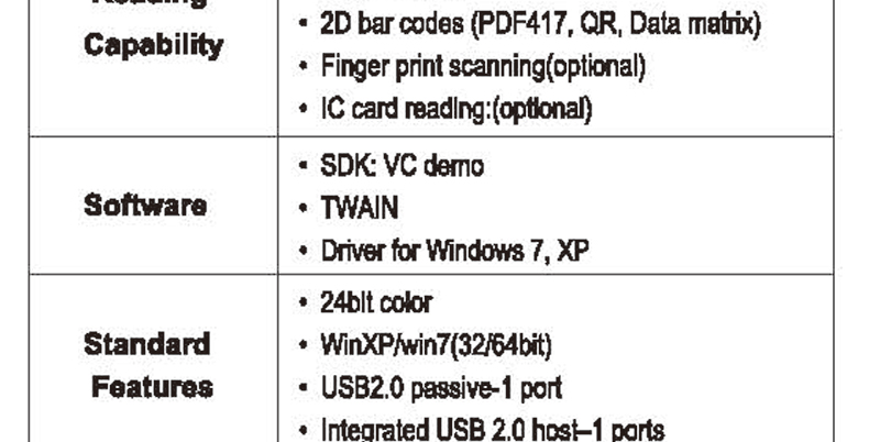 ? 2D bar codes (PDF417, QR, Data matrix) ? Finger print scanning(optional) |