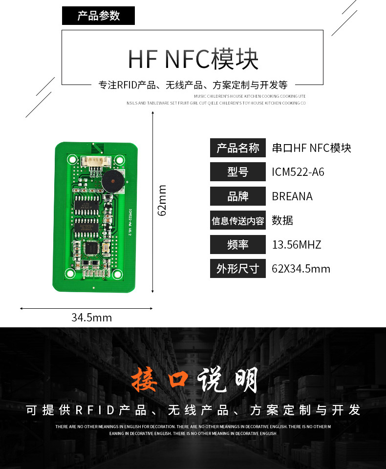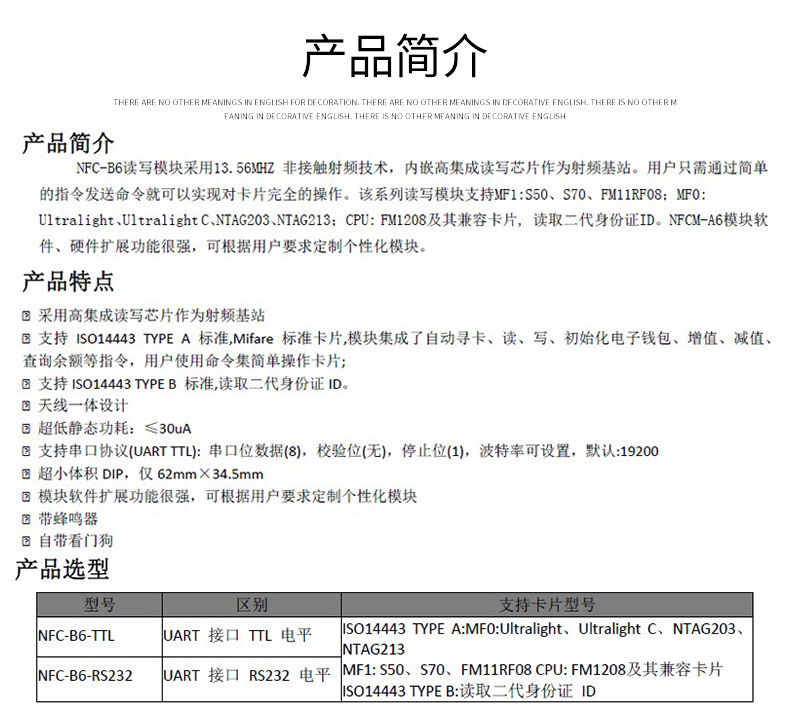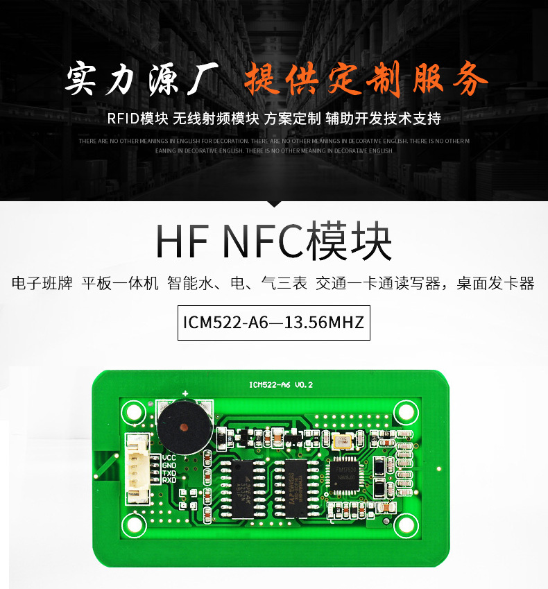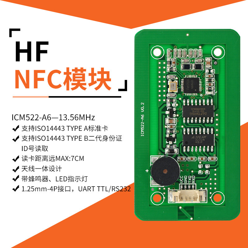 NFC-B6讀寫模塊采用13.56MHZ 非接觸射頻技術(shù),內(nèi)嵌高集成讀寫芯片作為射頻基站。用戶只需通過簡單的指令發(fā)送命令就可以實(shí)現(xiàn)對卡片完全的操作。該系列讀寫模塊支持MF1:S50、S70、FM11RF08;MF0: Ultralight、Ultralight C、NTAG203、NTAG213;CPU: FM1208及其兼容卡片, 讀取二代身份證ID。NFCM-A6模塊軟件、硬件擴(kuò)展功能很強(qiáng),可根據(jù)用戶要求定制個性化模塊。