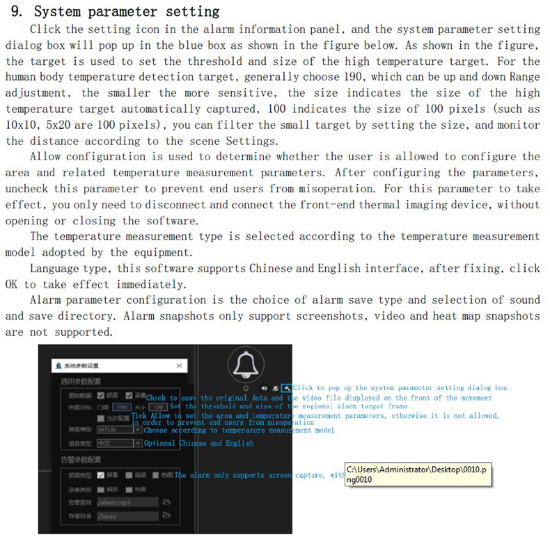 點擊告警信息面板中的設置圖標,如下圖藍框內(nèi),彈出系統(tǒng)參數(shù)設置對話框,如圖目標用于設置抓取高溫目標的門限和大小,對于人體測溫檢測目標一般選190,可以上下小范圍調整,越小越靈敏,大小表示自動抓取高溫目標的大小,100表示100個像數(shù)的大?。ㄈ?span>10x10,5x20都是100像數(shù)),可以通過設置大小過濾小目標,根據(jù)場景監(jiān)控距離設置。