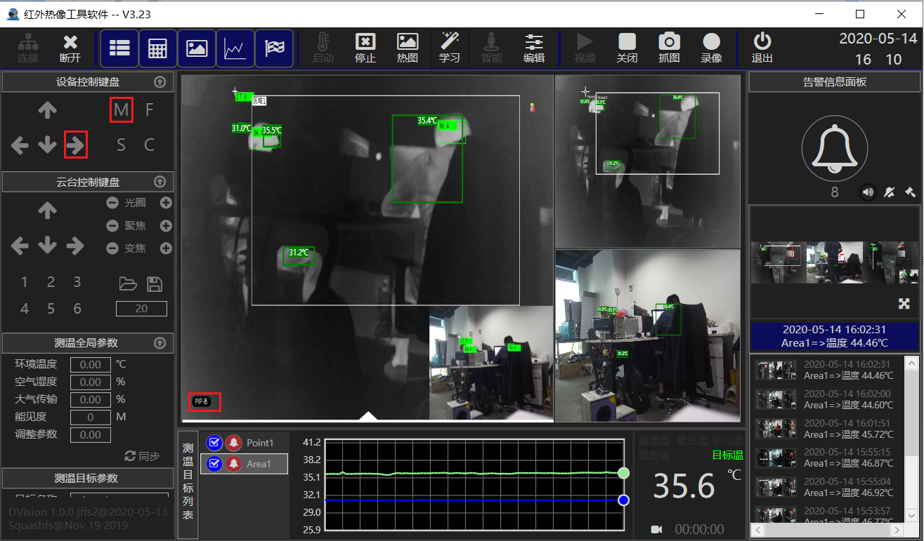 設置好區(qū)域及參數(shù),就可以開始測試,查看設置區(qū)域人員測溫是否準確,是否誤報,如有溫度顯示不正常,可重新學習校正。檢查環(huán)境是否有干擾源,如取暖設備;如果正常,就可以開始監(jiān)控使用,如檢測到人員超溫,系統(tǒng)會告警后抓圖,圖片可以軟件右邊區(qū)域查看。報警人員需通過體溫計再次測試確認。