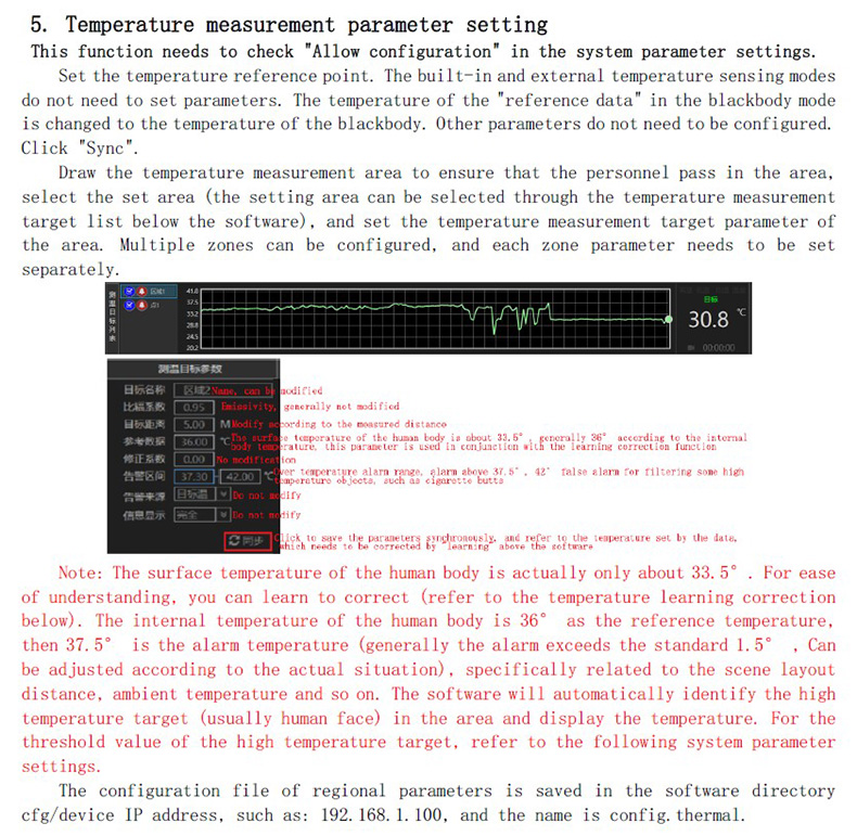 注:人體表面溫度實際只有33.5°左右,為了便于理解,可以通過學習校正(參考下面溫度學習校正)人體體內(nèi)溫度36°為基準溫,那么按37.5°為報警溫度(一般按超過標準1.5°報警,可根據(jù)實際情況調整),具體和場景布置距離,環(huán)境溫度等有關。軟件會自動標識區(qū)域內(nèi)的高溫目標(一般是人臉)并顯示溫度,抓取高溫目標的門限值參考下面系統(tǒng)參數(shù)設置。