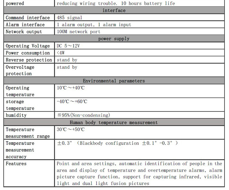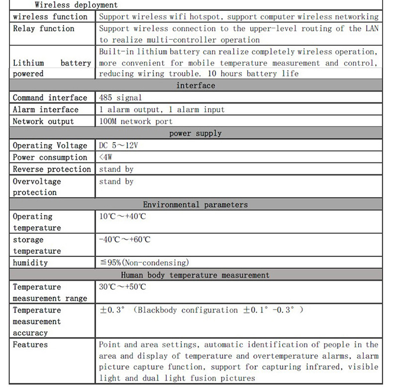 內(nèi)置鋰電池,可實現(xiàn)完全無線操作,更方便移動測溫布控,減少布線麻煩。電池續(xù)電時間10個小時 |