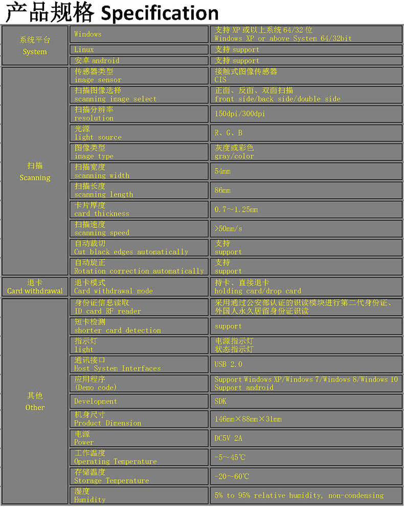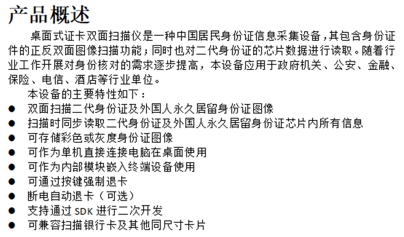 桌面式證卡雙面掃描儀是一種中國居民身份證信息采集設(shè)備,其包含身份證件的正反雙面圖像掃描功能;同時(shí)也對(duì)二代身份證的芯片數(shù)據(jù)進(jìn)行讀取。隨著行業(yè)工作開展對(duì)身份核對(duì)的需求逐步提高,本設(shè)備應(yīng)用于政府機(jī)關(guān)、公安、金融、保險(xiǎn)、電信、酒店等行業(yè)單位。