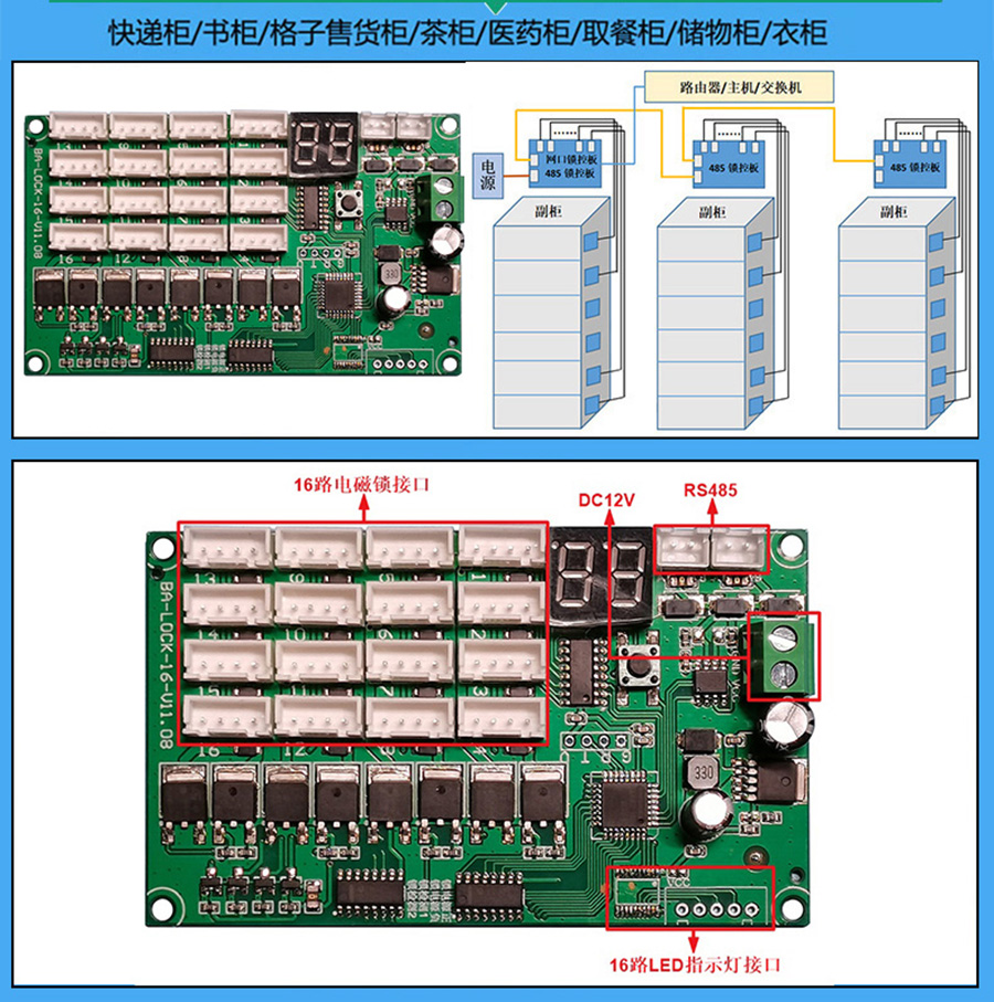 鎖控板廣泛應(yīng)用于智能快遞柜、格子售貨柜、口紅柜、儲(chǔ)物柜、設(shè)備售書機(jī)、信報(bào)箱、寄存柜、物流柜、文件柜、電表箱、更衣柜、自動(dòng)售販機(jī)、手機(jī)柜、鞋柜等集中控制箱柜。