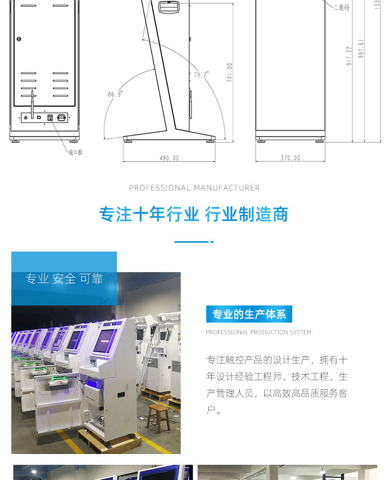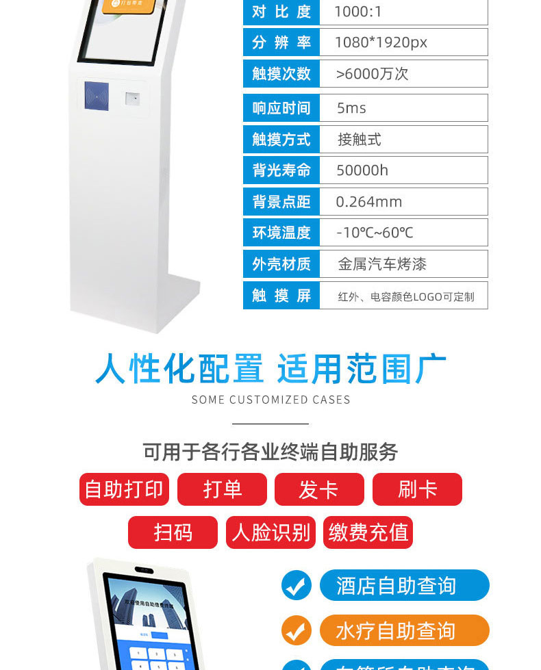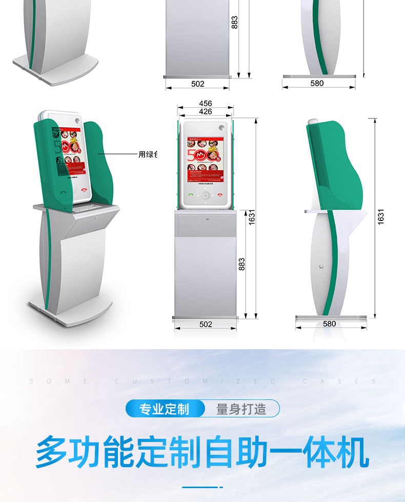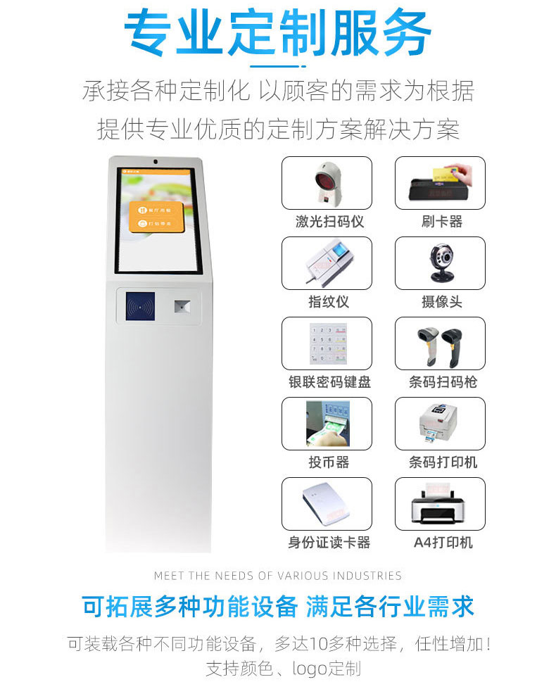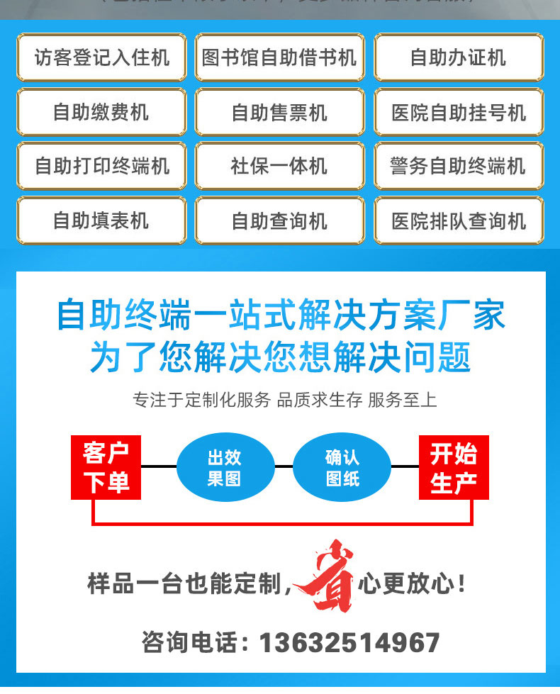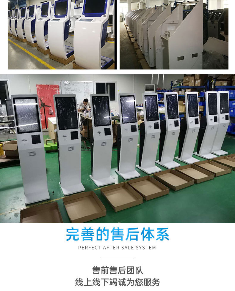 擁有專業(yè)的生產(chǎn)線,嚴(yán)格的質(zhì)量把控。耐心的咨詢服務(wù)團(tuán)隊(duì)及專業(yè)的技術(shù)負(fù)責(zé)團(tuán)體。 成產(chǎn)以“誠信、團(tuán)結(jié)、務(wù)實(shí)、創(chuàng)新”的企業(yè)精神開拓市場(chǎng)、優(yōu)化產(chǎn)品細(xì)節(jié)提供舒適的自助體驗(yàn)。公司本著“誠信為本,質(zhì)量至上”的取勝之道不斷開發(fā)自助終端在各行業(yè)的應(yīng)用,打造方便快捷的一站式服務(wù)。設(shè)備圖紙?jiān)O(shè)計(jì)-數(shù)控沖壓-折彎-焊接-刮灰打磨-磨砂清洗-噴底漆-高溫烤漆-機(jī)柜部件拼裝-配件安裝-整機(jī)調(diào)試?yán)先A測(cè)試-打包發(fā)貨;制實(shí)用的自助終端設(shè)備,我們是專業(yè)。多種定制款式任意選擇,可根據(jù)需求定制外觀屏幕尺寸可選,配件數(shù)量可選,主機(jī)配置可選。