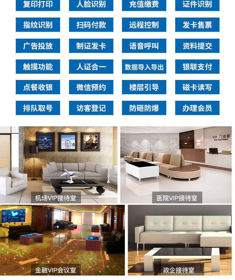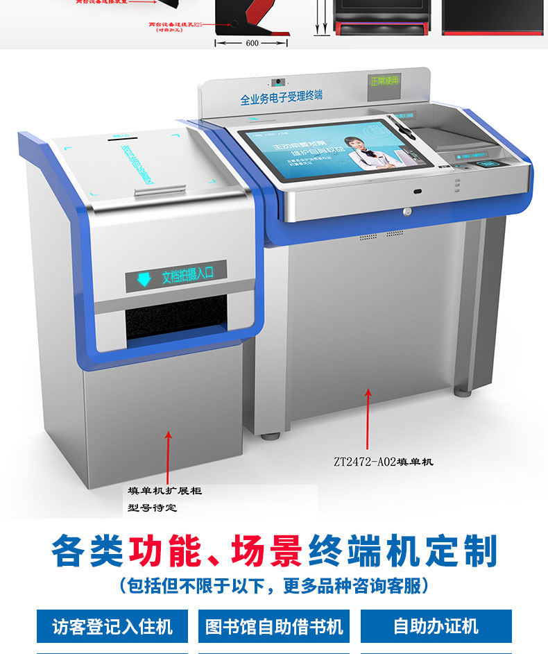 自助終端機(jī)定制:定制各種場(chǎng)景各種款式非標(biāo)終端機(jī);例如訪客機(jī)、景區(qū)自助取票機(jī)、醫(yī)院繳費(fèi)查詢機(jī)、醫(yī)院自助取單機(jī)、社保查詢機(jī)、室內(nèi)外廣告機(jī)、排隊(duì)叫號(hào)機(jī)、工控一體機(jī)、電力繳費(fèi)查詢機(jī)、圖書自助銷售機(jī)、便攜式計(jì)算機(jī)、酒店自助入住機(jī)、自助收銀機(jī)等終端。