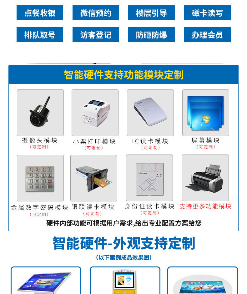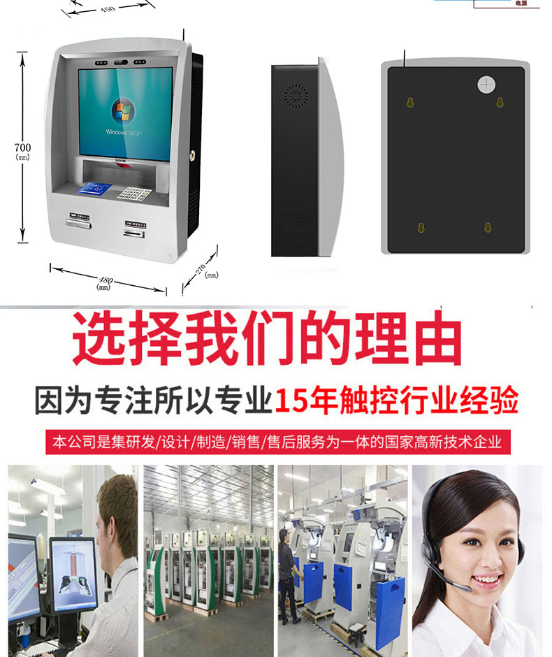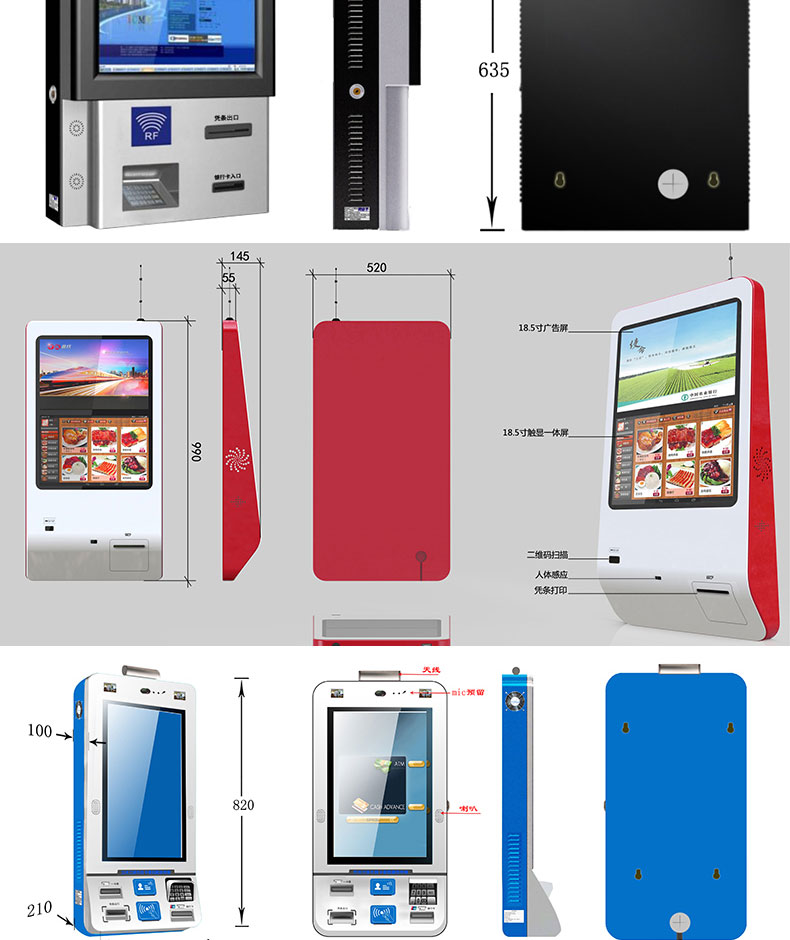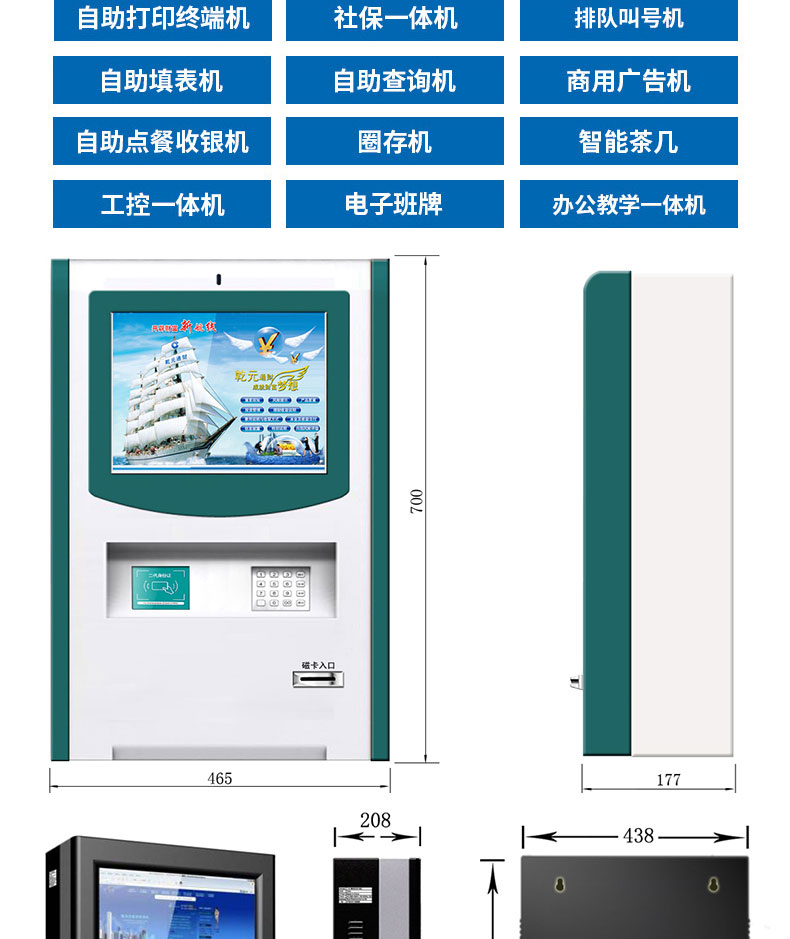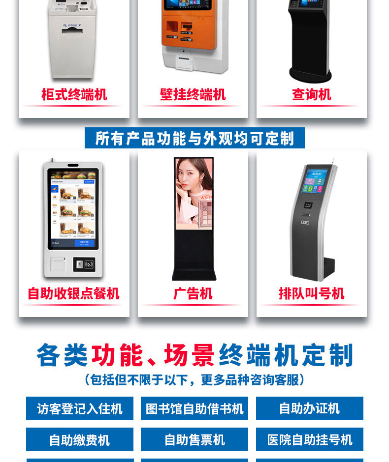 自助終端機定制:定制各種場景各種款式非標終端機;例如訪客機、景區(qū)自助取票機、醫(yī)院繳費查詢機、醫(yī)院自助取單機、社保查詢機、室內(nèi)外廣告機、排隊叫號機、工控一體機、電力繳費查詢機、圖書自助銷售機、便攜式計算機、酒店自助入住機、自助收銀機等終端。
