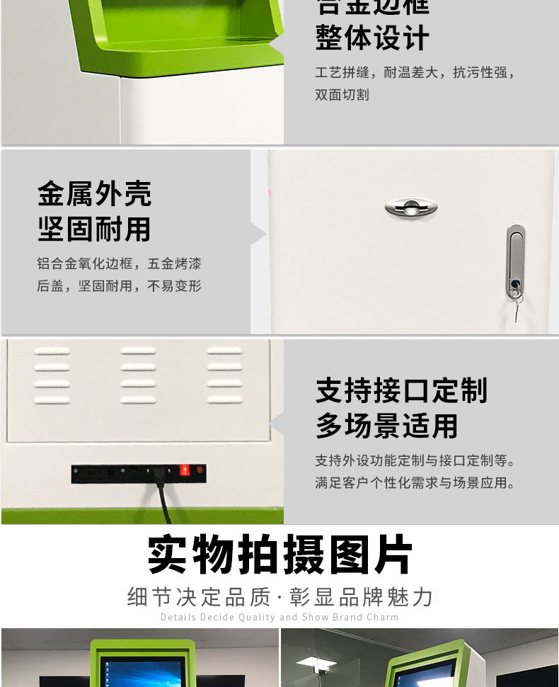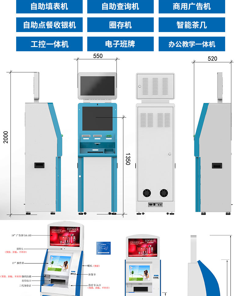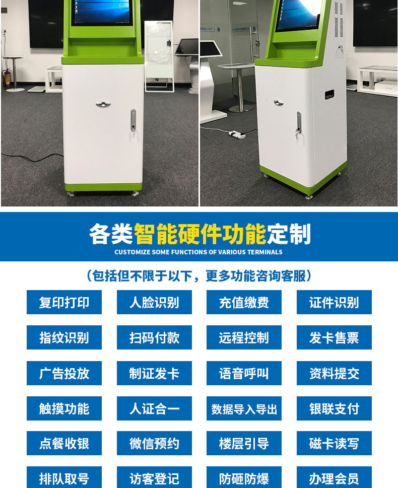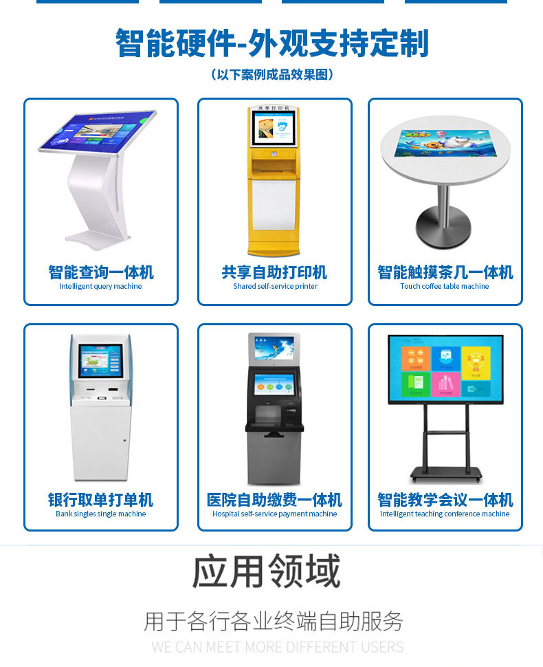 自助終端機(jī)定制:定制各種場(chǎng)景各種款式非標(biāo)終端機(jī);例如訪客機(jī)、景區(qū)自助取票機(jī)、醫(yī)院繳費(fèi)查詢機(jī)、醫(yī)院自助取單機(jī)、社保查詢機(jī)、室內(nèi)外廣告機(jī)、排隊(duì)叫號(hào)機(jī)、工控一體機(jī)、電力繳費(fèi)查詢機(jī)、圖書自助銷售機(jī)、便攜式計(jì)算機(jī)、酒店自助入住機(jī)、自助收銀機(jī)等終端。