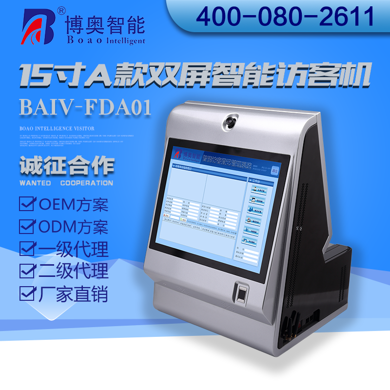 ? ? ? 15寸A款雙屏智能訪客機是博奧智能自主開發(fā),采用人體工程學與模塊化設計相結(jié)合,選用鈑金材料、洗車烤漆工藝加工出來的一款訪客管理終端,訪客管理終端內(nèi)部裝有WIN7操作系統(tǒng) SQL Server數(shù)據(jù)庫及我公司自主開發(fā)的訪客登記管理軟件等主要軟件,從而匯集成了一套完善的智能訪客登記管理系統(tǒng),它具有外觀精美,功能完善,操作方便等特點。