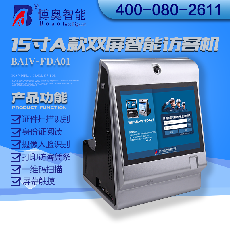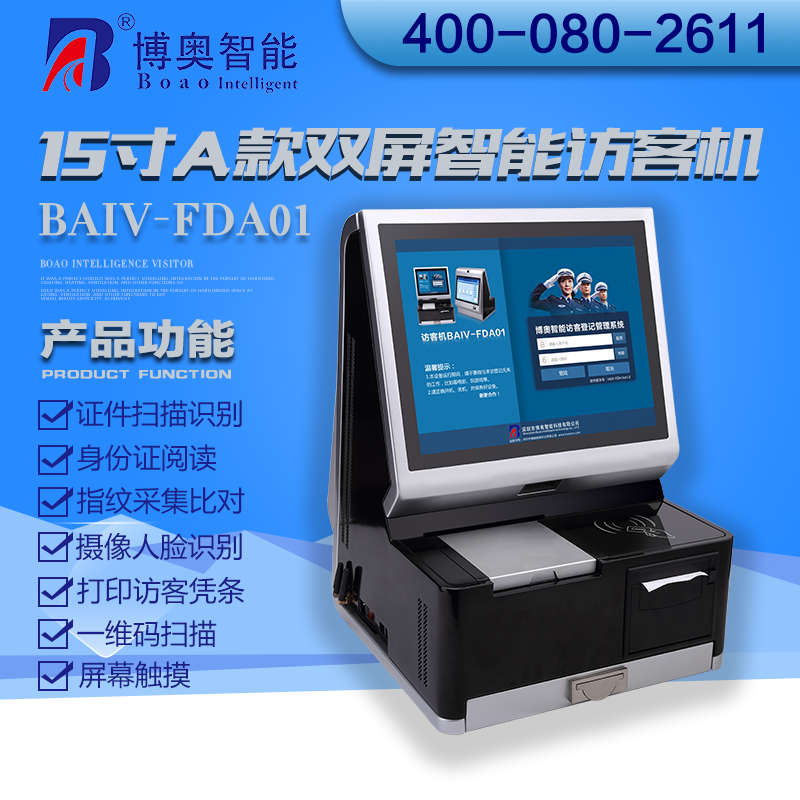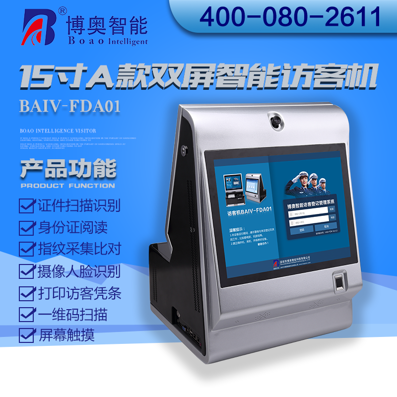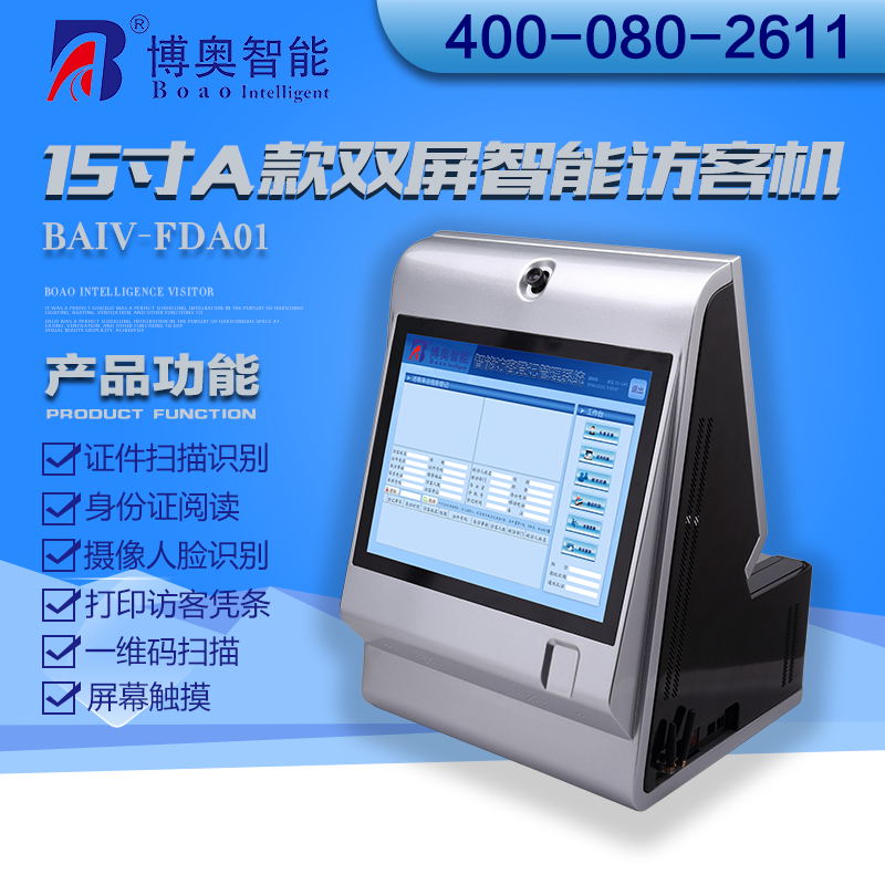 ? ? ? 15寸A款雙屏智能訪客機利用用計算機、觸摸屏手寫、證件識別(OCR),射頻識別、指紋生物識別、熱敏打印、條碼、數(shù)碼攝像、自動制證、硬件加密、網(wǎng)絡等技術(shù)實現(xiàn)智能信息化訪客登記管理,將目前手工填寫出入登記管理、電話咨詢被訪人等傳統(tǒng)方式轉(zhuǎn)變?yōu)楦呖萍嫉挠嬎銠C化、信息數(shù)字化處理,消除了手寫登記填寫時間長,容易出錯,信息缺失虛假多,不易保存,信息查詢困難等種種弊端;訪客登記管理系統(tǒng)能夠準確快速的對來訪人員的證件、圖像、指紋等信息進行識別登記并保存,以便日后查詢,同時利用聯(lián)動功能,可以對進出車輛自動識別登記。