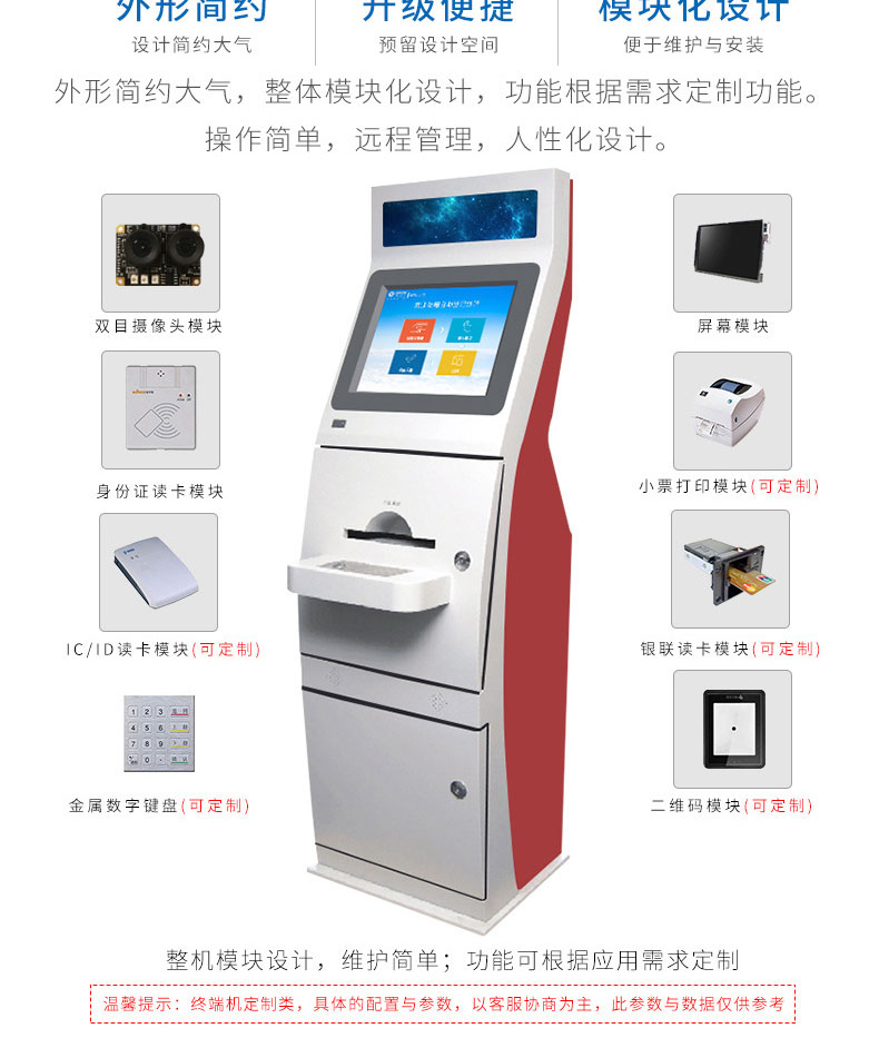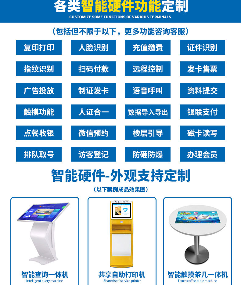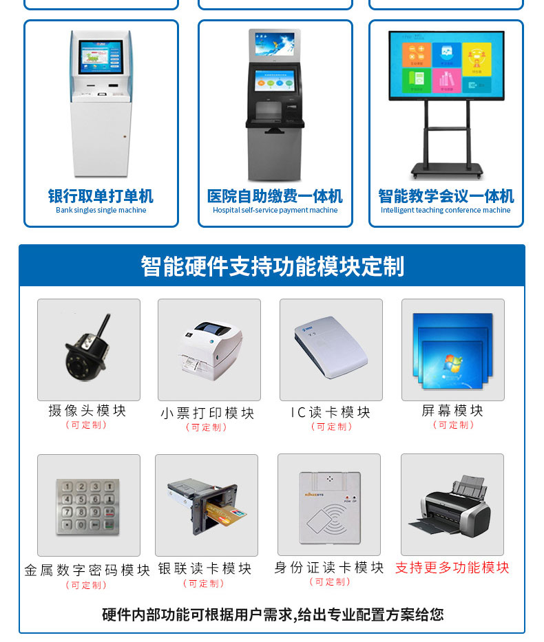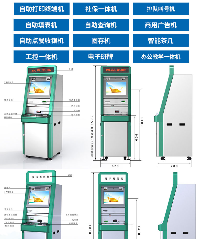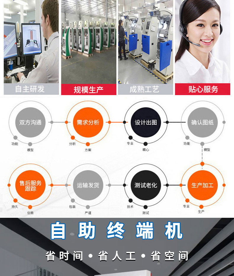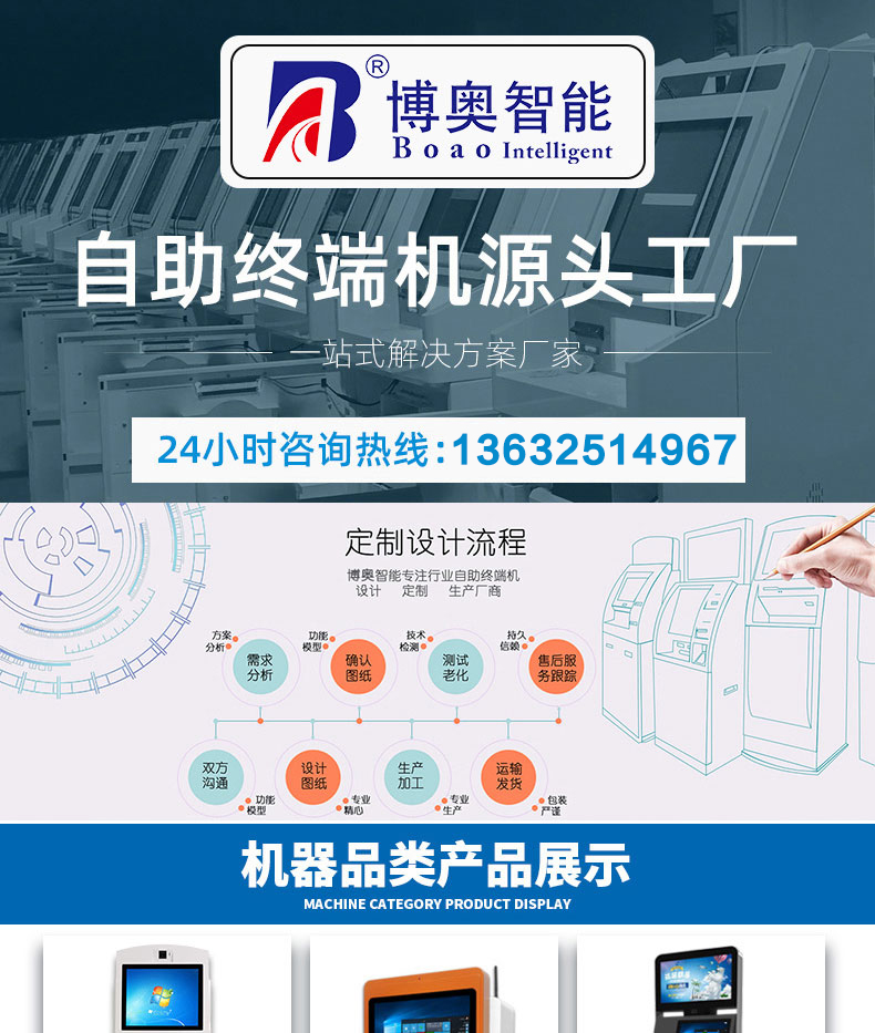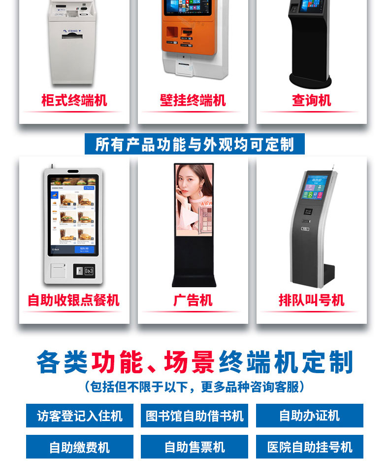 專業(yè)提供電腦觸控產(chǎn)品、自助服務(wù)終端的設(shè)計(jì)及生產(chǎn)服務(wù),主要產(chǎn)品自助終端機(jī)、自助打印機(jī)、自助取票機(jī)、自助查詢機(jī)、自助繳費(fèi)機(jī)、自助發(fā)卡機(jī)、自助政務(wù)一體機(jī),產(chǎn)品使用于各個(gè)行業(yè);醫(yī)院、學(xué)校、銀行、酒店、景區(qū)等。。。。。公司擁有專業(yè)的生產(chǎn)線,嚴(yán)格的質(zhì)量把控。耐心的咨詢服務(wù)團(tuán)隊(duì)及專業(yè)的技術(shù)負(fù)責(zé)團(tuán)體。