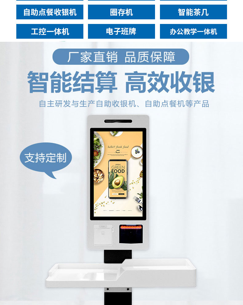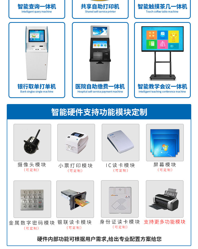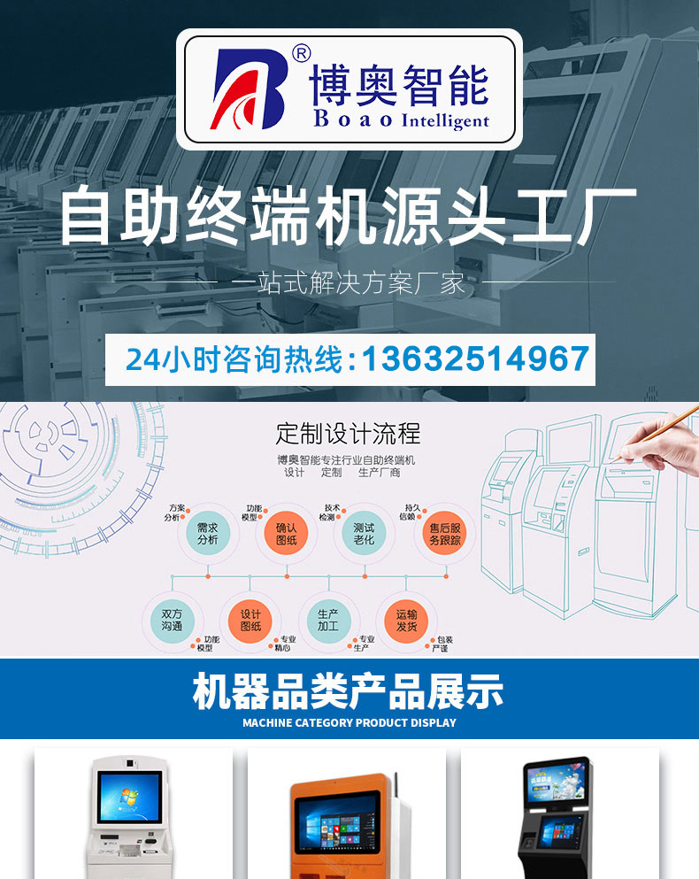 專業(yè)提供電腦觸控產(chǎn)品、自助服務(wù)終端的設(shè)計及生產(chǎn)服務(wù),主要產(chǎn)品自助終端機、自助打印機、自助取票機、自助查詢機、自助繳費機、自助發(fā)卡機、自助政務(wù)一體機,產(chǎn)品使用于各個行業(yè);醫(yī)院、學(xué)校、銀行、酒店、景區(qū)等。。。。。公司擁有專業(yè)的生產(chǎn)線,嚴(yán)格的質(zhì)量把控。耐心的咨詢服務(wù)團隊及專業(yè)的技術(shù)負(fù)責(zé)團體。