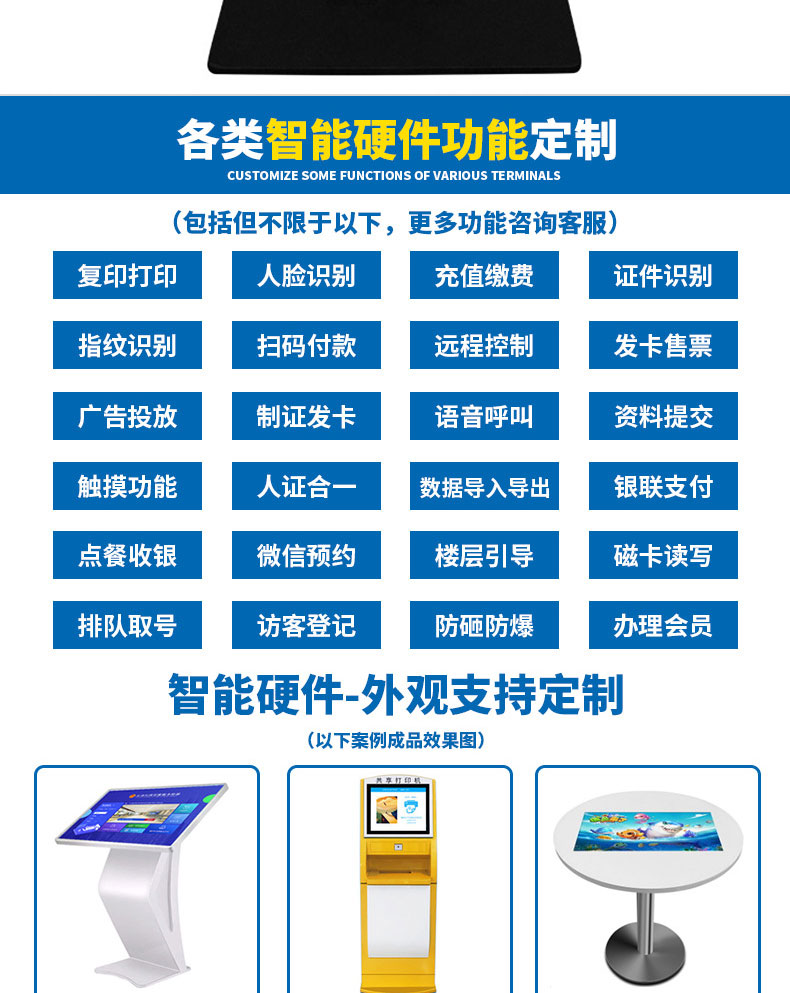 定制實用的自助終端設(shè)備,我們是專業(yè)。多種定制款式任意選擇,可根據(jù)需求定制外觀屏幕尺寸可選,配件數(shù)量可選,主機配置可選。