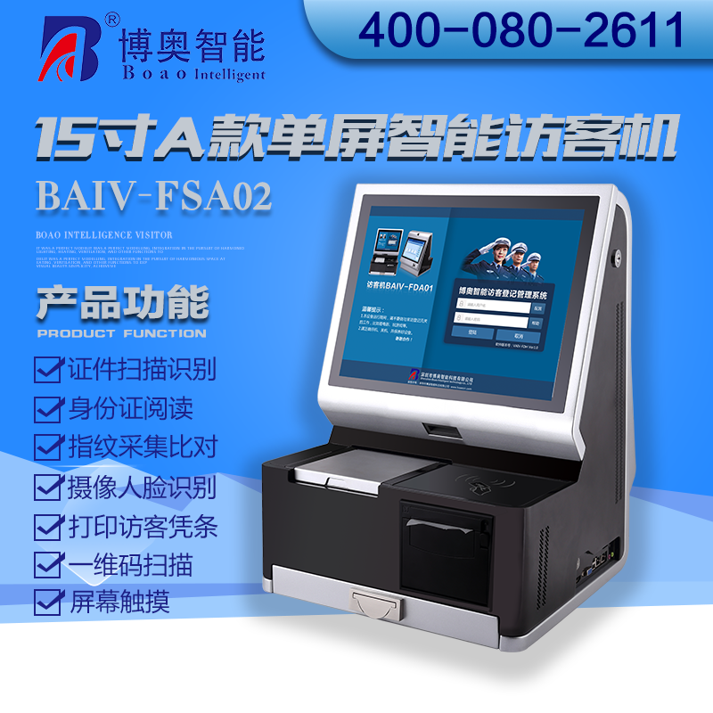 ? ? ? ?15寸A款雙屏智能訪客機利用計算機、觸摸屏手寫、證件識別(OCR),射頻識別、指紋生物識別、熱敏打印、條碼、數(shù)碼攝像、自動制證、硬件加密、網(wǎng)絡(luò)等技術(shù)實現(xiàn)智能信息化訪客登記管理,將目前手工填寫出入登記管理、電話咨詢被訪人等傳統(tǒng)方式轉(zhuǎn)變?yōu)楦呖萍嫉挠嬎銠C化、信息數(shù)字化處理,消除了手寫登記填寫時間長,容易出錯,信息缺失虛假多,不易保存,信息查詢困難等種種弊端;訪客登記管理系統(tǒng)能夠準(zhǔn)確快速的對來訪人員的證件、圖像、指紋等信息進(jìn)行識別登記并保存,以便日后查詢,同時利用聯(lián)動功能,可以對進(jìn)出車輛自動識別登記。