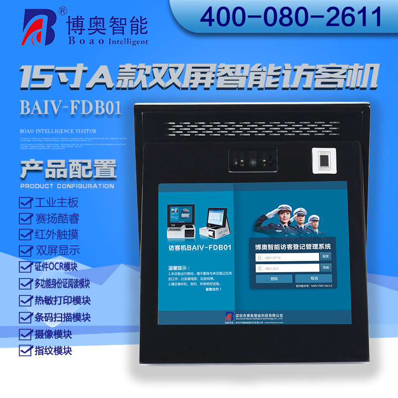 ? ? ? 15寸B款雙屏智能訪客機(jī)是博奧智能自主開發(fā),采用人體工程學(xué)與模塊化設(shè)計(jì)相結(jié)合,融合計(jì)算機(jī)、觸摸屏手寫、證件識別(OCR),射頻識別、指紋生物識別、熱敏打印、條碼、數(shù)碼攝像、自動制證、硬件加密、網(wǎng)絡(luò)等技術(shù);選用鈑金材料、表面噴粉工藝加工出來的一款訪客管理終端,訪客管理終端內(nèi)部裝有WIN7操作系統(tǒng)SQL Server數(shù)據(jù)庫及我公司自主開發(fā)的訪客登記管理軟件等主要軟件,從而匯集成了一套完善的智能訪客登記管理系統(tǒng),它具有外觀精美,功能完善,操作方便等特點(diǎn)。