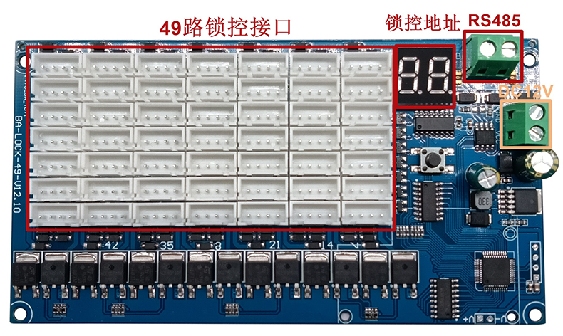 49路鎖控板又名為電子鎖控制模塊,主要用來控制各類格子柜門電子鎖的開與關,板子集成49路鎖控杜邦接口,485通信接口,DC電源接口,鎖控地址顯示模塊,一鍵全開功能!板子通過485通信協(xié)議,實現(xiàn)電腦串口助手發(fā)送數(shù)據(jù)開鎖和獲取箱門狀態(tài)反饋!