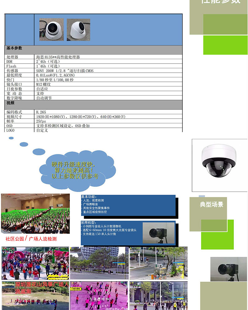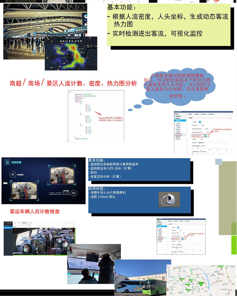 智能AI攝像機采用領先的視覺技術(shù),獲取目標的深度信息,結(jié)合智能跟蹤算法分析行人的行為軌跡,對計數(shù)區(qū)域進行分塊處理,計算各區(qū)塊邊界線上人員通行的方向及人數(shù),實現(xiàn)高精度的客流統(tǒng)計效果;廣泛應用到商場超市景區(qū)客站臨時活動等場所用來智能監(jiān)控;客流人數(shù)統(tǒng)計及軌跡跟蹤。攝像機是把光學圖像信號轉(zhuǎn)變?yōu)殡娦盘枺员阌诖鎯蛘邆鬏數(shù)囊环N機器。當我們拍攝一個物體時,此物體上反射的光被攝像機鏡頭收集,使其聚焦在攝像器件的受光面上,再通過攝像器件把光轉(zhuǎn)變?yōu)殡娔?,即得到了“視頻信號”,有的公交車上通過安裝攝像機來拍攝記錄上下車的行人,再通過車載設備統(tǒng)計實時經(jīng)過攝像機的客流量,因此攝像機是客流量統(tǒng)計系統(tǒng)中的重要一個部件。傳統(tǒng)的攝像機一般安裝在公交車車廂內(nèi)部的車頂,由于每個公交車的內(nèi)飾有區(qū)別,有的攝像機可以直接安裝在車廂內(nèi)壁,有的只能采用懸掛的方式進行安裝,因此不同的車輛需要搭配不同的攝像機使用,攝像機的安裝適用范圍較窄,雖然有的攝像機內(nèi)部安裝減震結(jié)構(gòu)防止攝像機抖動,傳統(tǒng)的減震結(jié)構(gòu)一般采用彈簧或者橡膠墊減震,使用一段時間后彈簧容易變形或者橡膠墊易老化,導致減震效果變差。