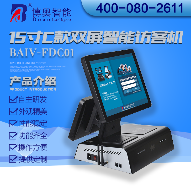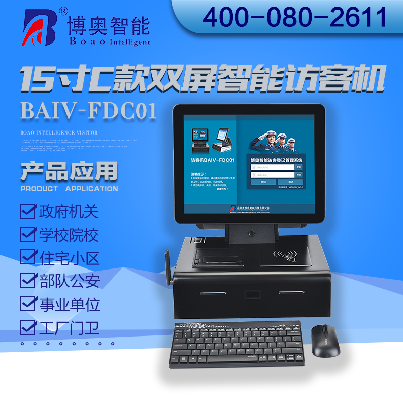 ? ? ? 15寸C款雙屏智能訪客機(jī)主要用在政府機(jī)關(guān)、關(guān)口、機(jī)場、軍隊(duì)、公安、法院、學(xué)校、事業(yè)單位、花園小區(qū)、高檔寫字樓、工廠等門衛(wèi)傳達(dá)室用來訪客登記管理;辦公大廳、營業(yè)大廳、醫(yī)院等場所做為辦公設(shè)備