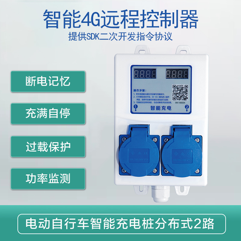 智能4G遠程控制器雙路電動車充電樁插座免費提供SDK指令協(xié)議支持定制開發(fā) 智能4G遠程控制器, 雙路電動車充電樁,共享洗衣機空調(diào)插座,專業(yè)團隊研發(fā),微信掃碼 APP同步實時反饋,界面操作直觀。采取4G信號,相比2G信號更加穩(wěn)定,兩路相比十路;兩路安裝方便,更換與維修更快捷,節(jié)約各項成本,減少維護費用;可用千各行業(yè):養(yǎng)殖業(yè)、農(nóng)業(yè)澆灌、路燈控制、智能家居、地下車庫等場所;接電啟動,面板亮顯數(shù)值,實時顯示日期、充電數(shù)據(jù)、當前功率、充電時長及消費的金額等數(shù)值,用戶可直接查看。 充滿自停,根據(jù)所需,自行設置充電時長。防水保護設計,操作方便;品質(zhì)保障