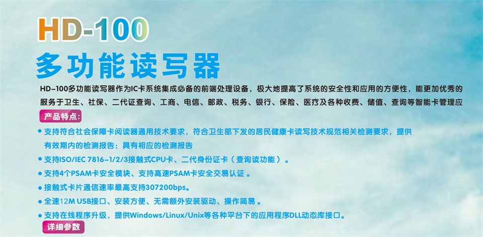 華大HD100身份證社保閱讀器產(chǎn)品是一款功能強大的身份證讀卡器,它采用智能技術(shù),可以一秒鐘完成身份證的采集和信息的讀取,識別速度快,準確率高。該產(chǎn)品廣泛應用于公安、交通、鐵路、民航、銀行、學校等企事業(yè)單位。