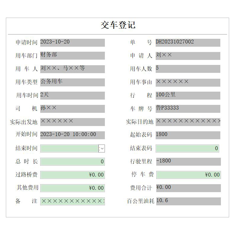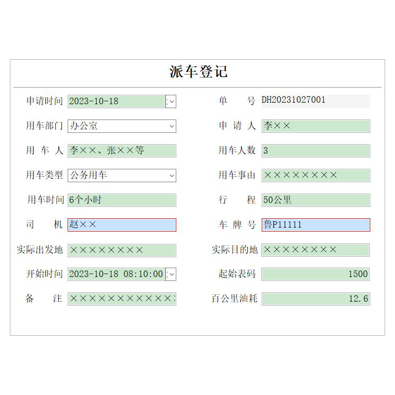 1、基本信息(用車部門、維修單位、年審單位、保險公司、油規(guī)格、車輛類型、車輛品牌、顏色、用途、本單位信息);