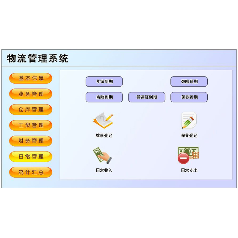 日常管理:系統(tǒng)提供了年審到期、強險到期、商險到期、營運證到期、保養(yǎng)到期、維修登記和日常收入支出等管理功能。這些功能有助于公司合理安排各項日常事務,確保業(yè)務正常運行。