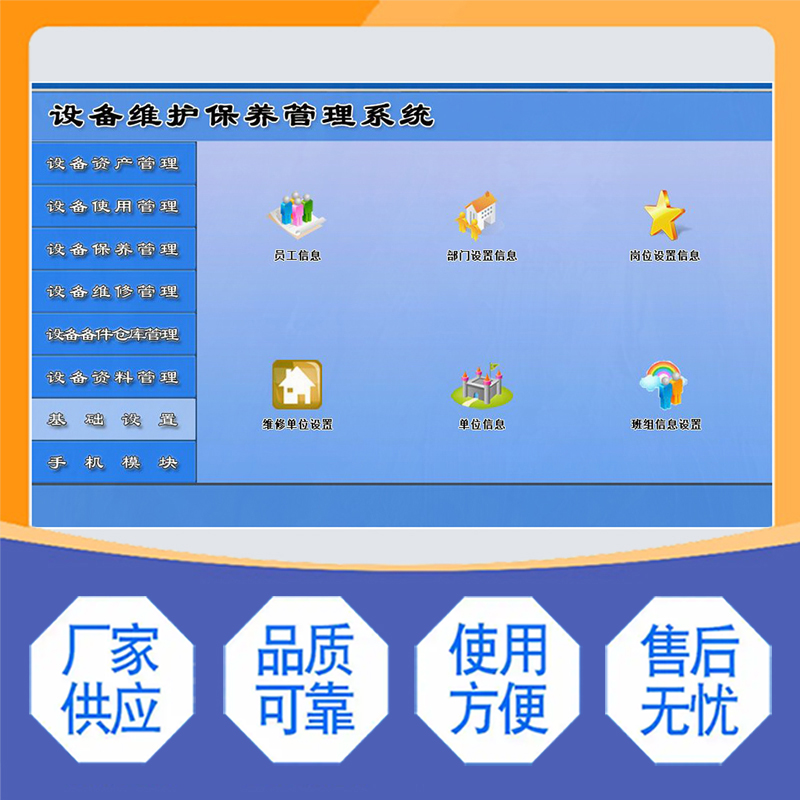 《設(shè)備維護(hù)保養(yǎng)管理系統(tǒng)》是一款全面管理設(shè)備資產(chǎn)、使用、保養(yǎng)、維修、備件及資料的軟件系統(tǒng)。該系統(tǒng)致力于幫助企業(yè)提高設(shè)備管理效率,降低設(shè)備維護(hù)成本,延長(zhǎng)設(shè)備使用壽命。系統(tǒng)涵蓋了設(shè)備資產(chǎn)管理、設(shè)備使用管理、設(shè)備保養(yǎng)管理、設(shè)備維修管理、設(shè)備備件倉(cāng)庫(kù)管理、設(shè)備資料管理、基礎(chǔ)設(shè)置和手機(jī)模塊,可對(duì)設(shè)備的狀況進(jìn)行全面管理,使用戶能夠及時(shí)了解設(shè)備的最新狀態(tài),提高工作效率。