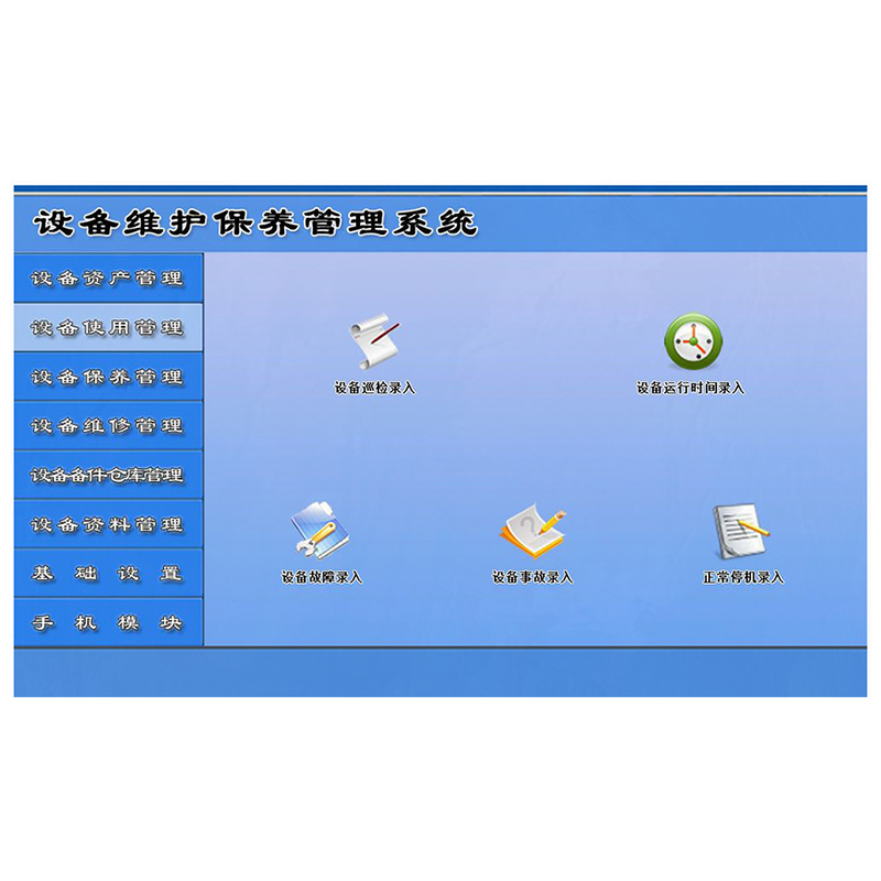 2、設(shè)備使用管理: 主要包括:設(shè)備巡檢錄入、設(shè)備運(yùn)行錄入、設(shè)備故障錄入、設(shè)備事故錄入、正常停機(jī)等,各明細(xì)記錄均可打印輸出。