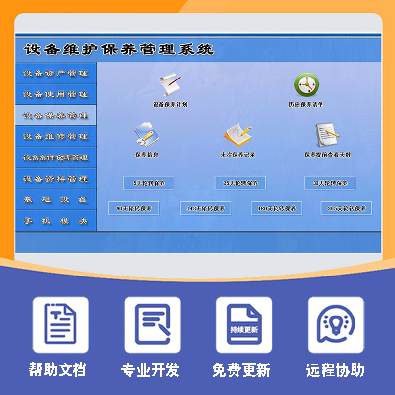 3、設(shè)備保養(yǎng)管理: 包括設(shè)備保養(yǎng)計(jì)劃、保養(yǎng)信息、歷史保養(yǎng)清單、5天輪轉(zhuǎn)保養(yǎng)、25天輪轉(zhuǎn)保養(yǎng)、38天輪轉(zhuǎn)保養(yǎng)、90天輪轉(zhuǎn)保養(yǎng)、143天輪轉(zhuǎn)保養(yǎng)、末次保養(yǎng)記錄等。設(shè)置首次保養(yǎng)時(shí)間,軟件將自動(dòng)輪轉(zhuǎn)提醒保養(yǎng)。