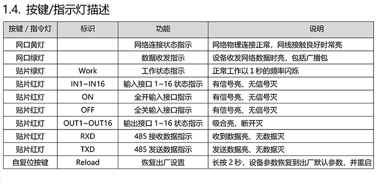 ??? 設(shè)備采用工業(yè)級(jí)設(shè)計(jì)方案,搭載32 ARM 處理器和10/100M 以太網(wǎng)網(wǎng)絡(luò)方案,具有速度快,運(yùn)算能力強(qiáng),穩(wěn)定性高,抗干擾能力強(qiáng)等特點(diǎn),滿足工業(yè)環(huán)境使用要求。設(shè)備有16 路繼電器輸出、18 路開關(guān)量隔離輸入和1 RS485 接口,繼電器支持實(shí)時(shí)控制、延時(shí)控制、輸入輸出聯(lián)動(dòng)控制、一鍵全開全關(guān)控制、日循環(huán)定時(shí)控制和自定義日期控制等多種控制方式,開關(guān)量輸入狀態(tài)支持被動(dòng)上傳、定時(shí)上傳和觸發(fā)上傳,RS485 接口支持用于控制設(shè)備或傳輸數(shù)據(jù),以滿足更多不同的場(chǎng)合使用,滿足更多用戶的使用需求。