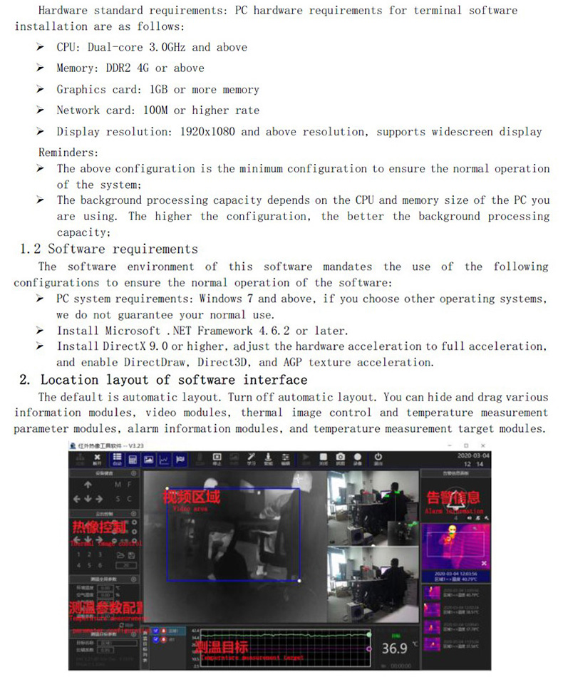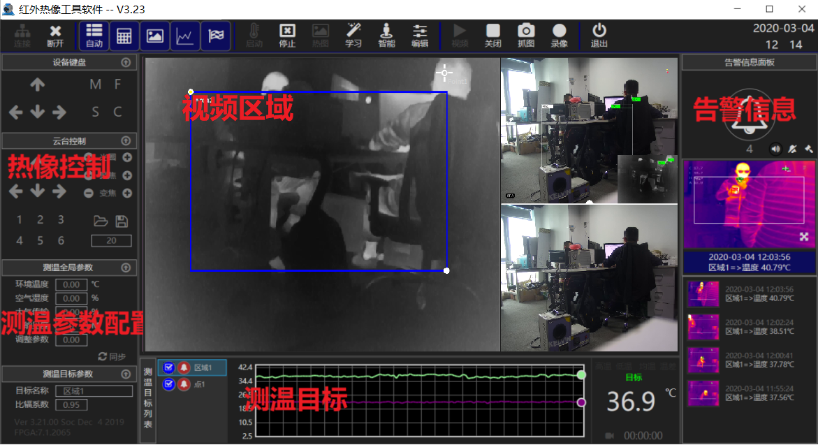 ??? 雙光模組通過網(wǎng)絡圖傳連接PC,PC端安裝測溫軟件,該軟件可以連接熱像和可見光視頻,可以設置點和區(qū)域測溫,區(qū)域內(nèi)可自動追蹤人員并顯示溫度,可配置超溫報警,實現(xiàn)報警抓拍功能。