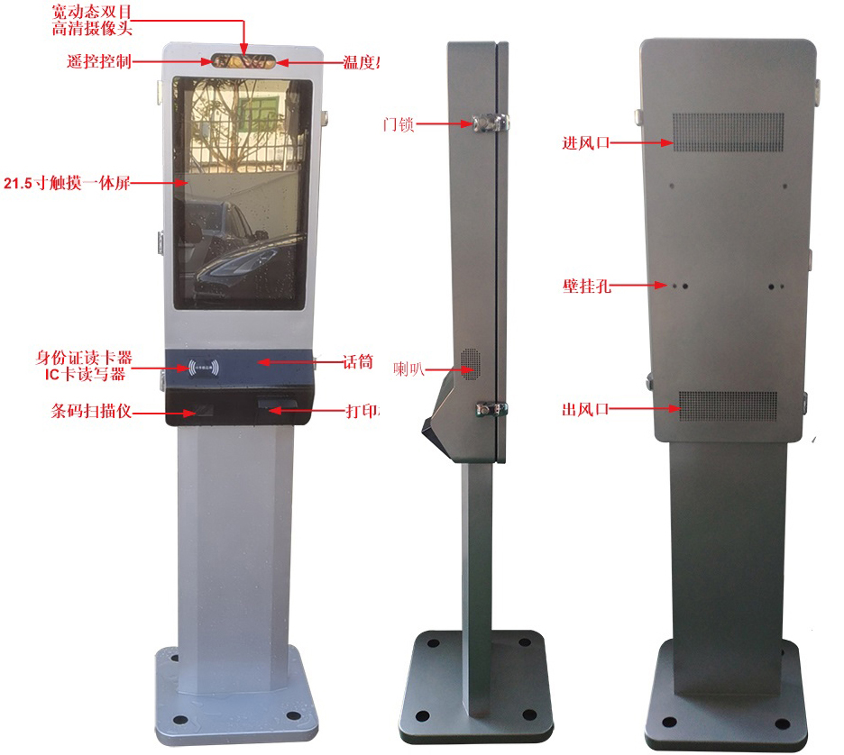 21.5寸室外多功能戶外一體機(jī)安裝方式支持壁掛和落地(立式)兩種方式,集成21.5寸高清液晶屏和室外專用電容觸摸屏;寬動態(tài)雙目攝像頭 ;身份證和IC卡讀卡器;熱敏打印機(jī);條碼掃描,RK3399工業(yè)主板等模塊。