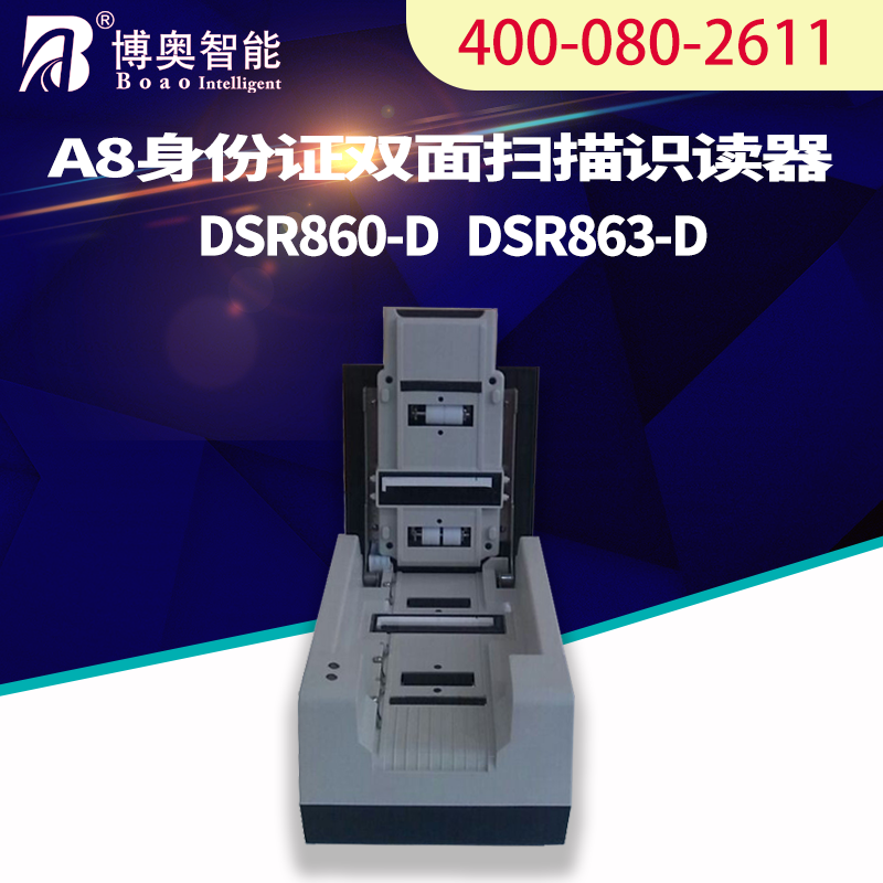 ? ? ? A8雙面掃描識(shí)讀器(DSR860-D) (以下簡(jiǎn)稱DSR860)是一款集成圖像掃描、國內(nèi)第二代身份證RFID數(shù)據(jù)讀取功能的嵌入式專用雙面掃描設(shè)備。產(chǎn)品設(shè)計(jì)采用光學(xué)分辨率為600dpi的A8接觸式影像傳感器(CIS),掃描精度為8bit(灰度)。通過設(shè)置相應(yīng)的工作模式,設(shè)備能對(duì)符合國內(nèi)第二代身份證標(biāo)準(zhǔn)的卡片進(jìn)行雙面掃描以及RFID數(shù)據(jù)讀取、解碼。