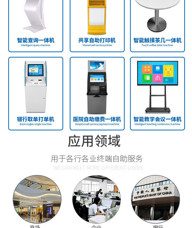 自助終端機定制:定制各種場景各種款式非標終端機;例如訪客機、景區(qū)自助取票機、醫(yī)院繳費查詢機、醫(yī)院自助取單機、社保查詢機、室內(nèi)外廣告機、排隊叫號機、工控一體機、電力繳費查詢機、圖書自助銷售機、便攜式計算機、酒店自助入住機、自助收銀機等終端。