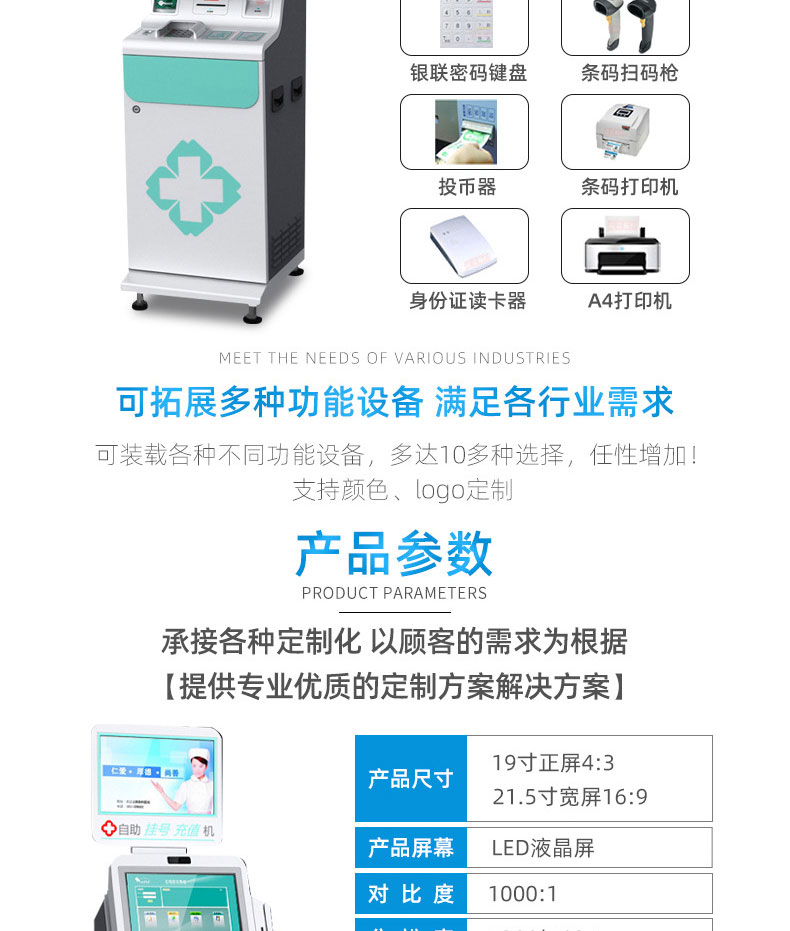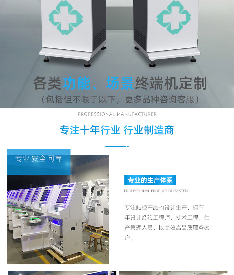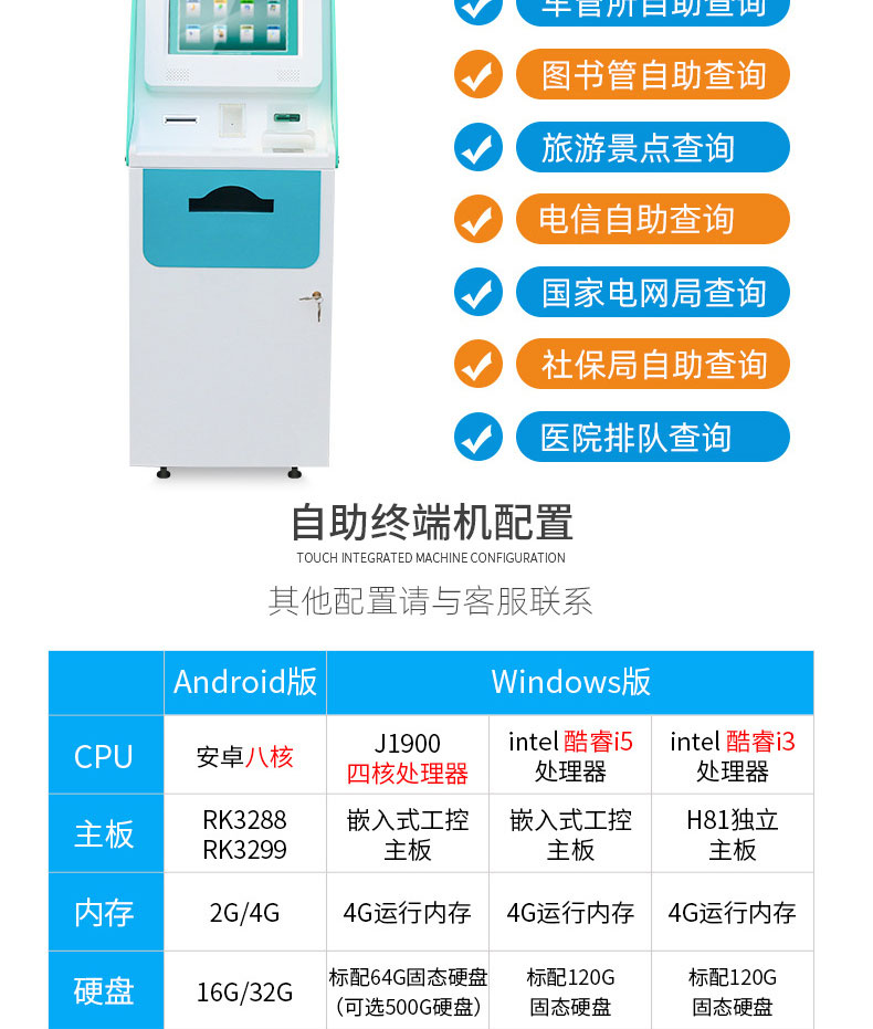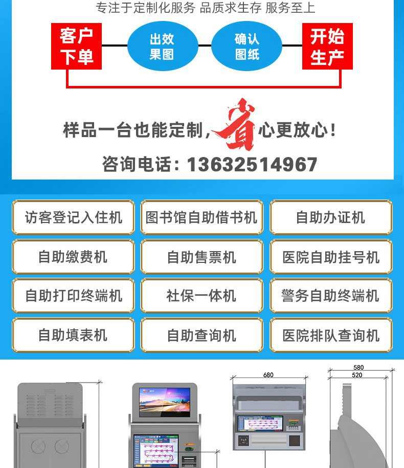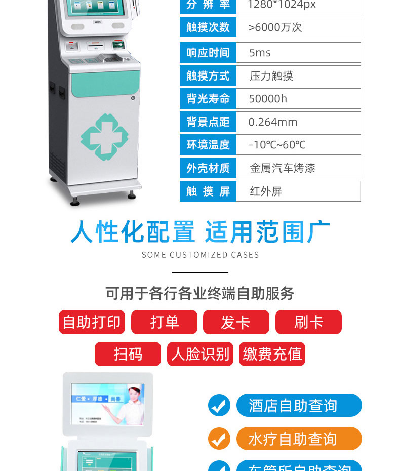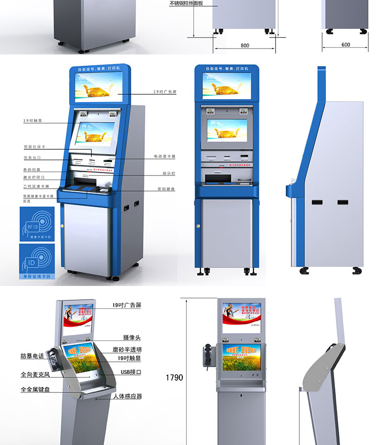自助終端機(jī)定制:定制各種場景各種款式非標(biāo)終端機(jī);例如訪客機(jī)、景區(qū)自助取票機(jī)、醫(yī)院繳費(fèi)查詢機(jī)、醫(yī)院自助取單機(jī)、社保查詢機(jī)、室內(nèi)外廣告機(jī)、排隊(duì)叫號機(jī)、工控一體機(jī)、電力繳費(fèi)查詢機(jī)、圖書自助銷售機(jī)、便攜式計(jì)算機(jī)、酒店自助入住機(jī)、自助收銀機(jī)等終端。