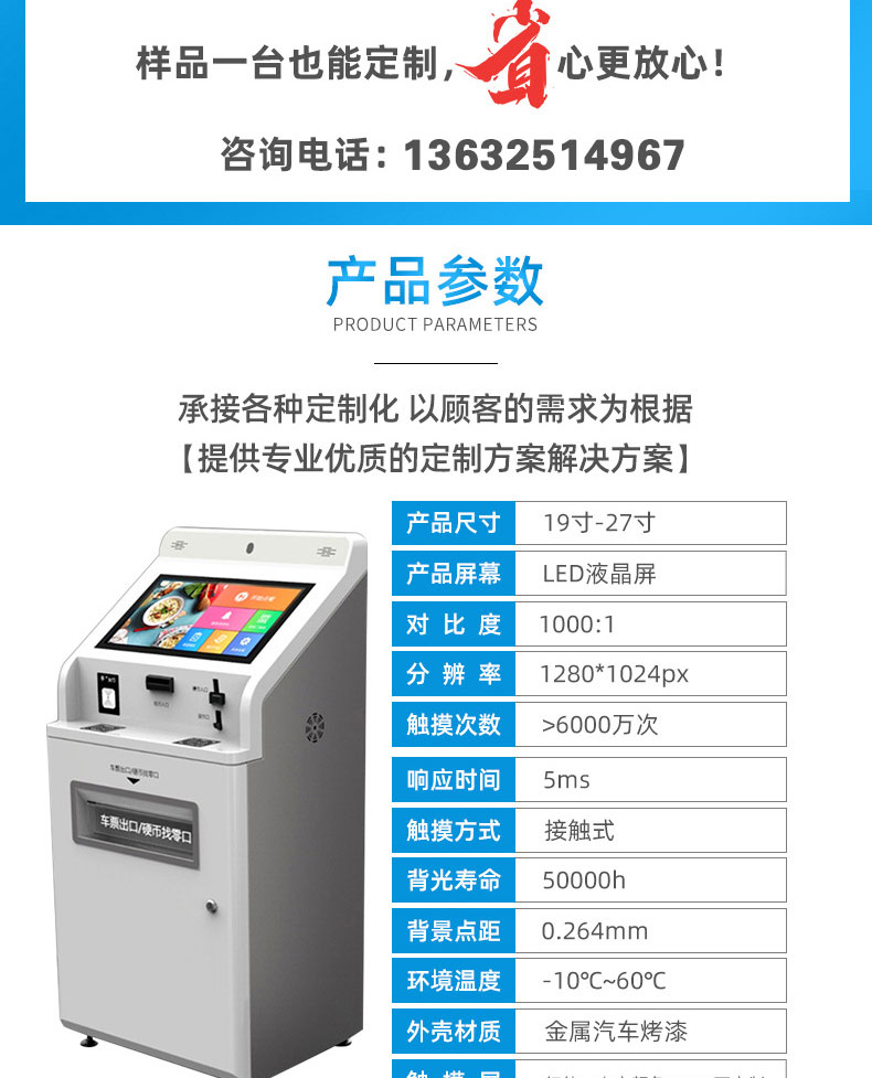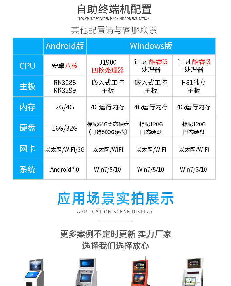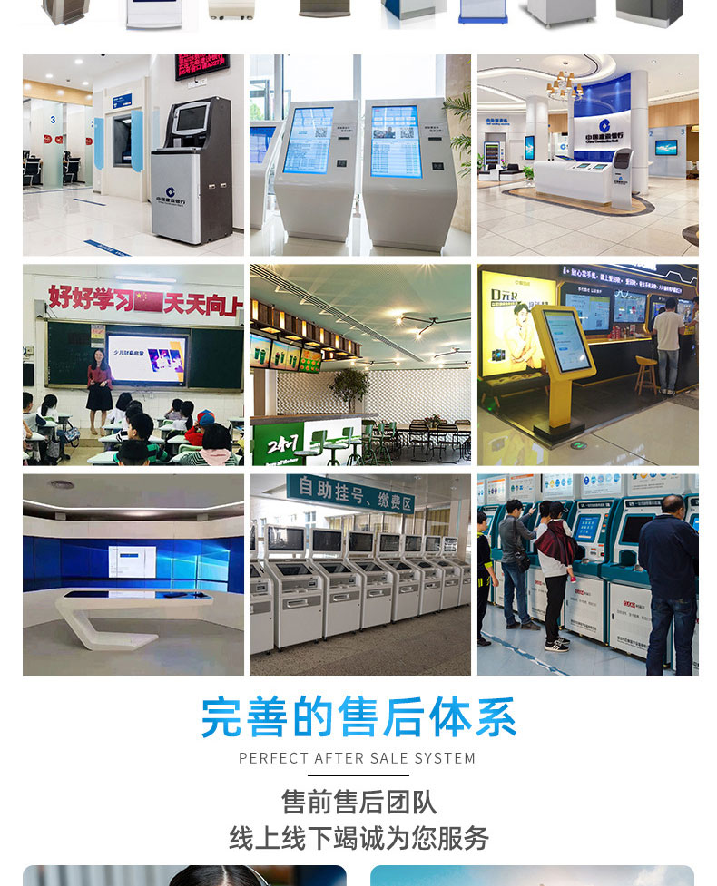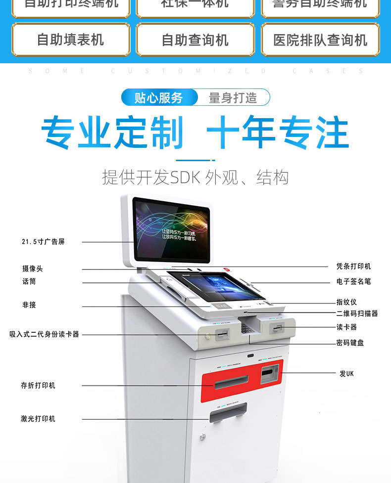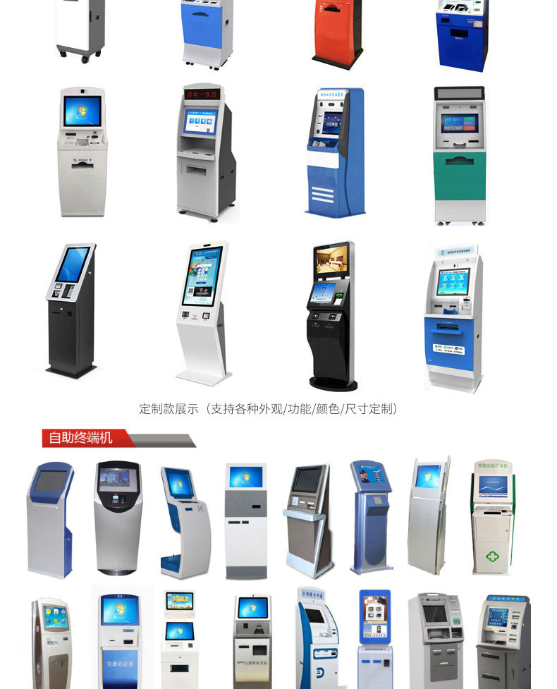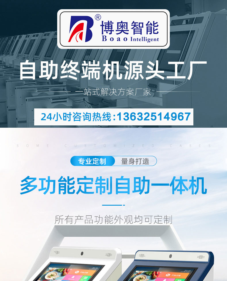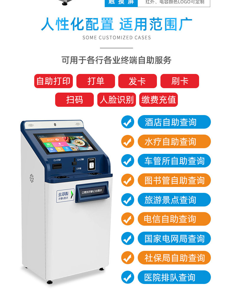 自助終端機定制:定制各種場景各種款式非標(biāo)終端機;例如訪客機、景區(qū)自助取票機、醫(yī)院繳費查詢機、醫(yī)院自助取單機、社保查詢機、室內(nèi)外廣告機、排隊叫號機、工控一體機、電力繳費查詢機、圖書自助銷售機、便攜式計算機、酒店自助入住機、自助收銀機等終端。